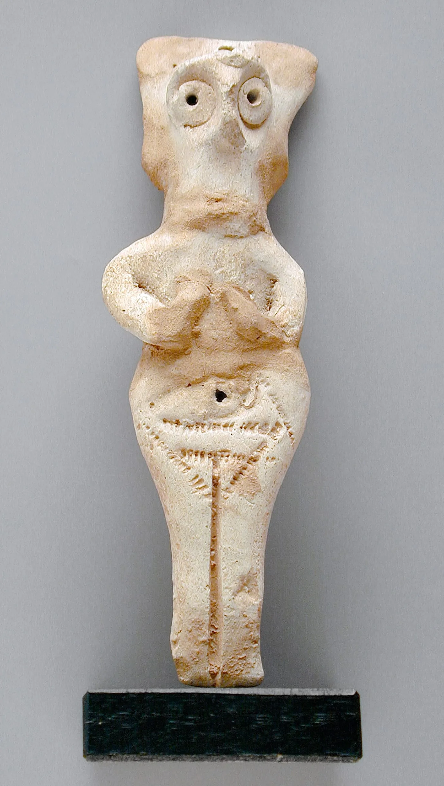 Small ivory-colored ceramic or stone figurine of a stylized standing human form with large circular eyes, crossed arms, and incised geometric patterns on the lower body, mounted on a black rectangular base