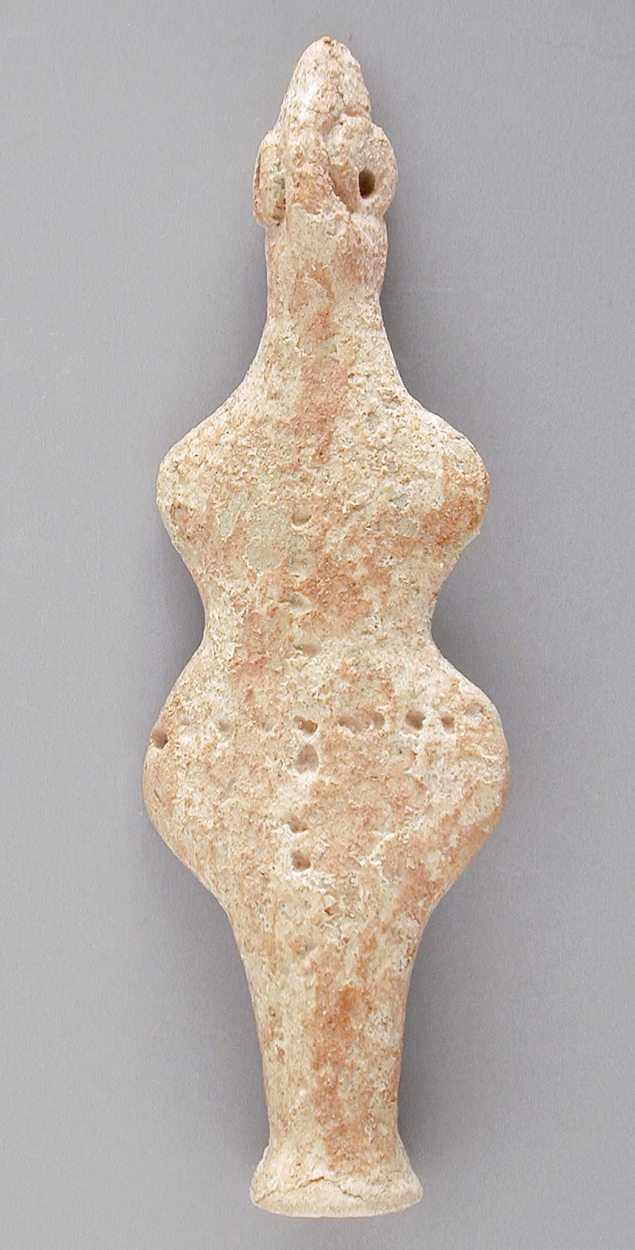 Small ancient ceramic figurine with stylized female form, cream surface with rust-orange patches, elongated pointed head, exaggerated hips, and tapering base
