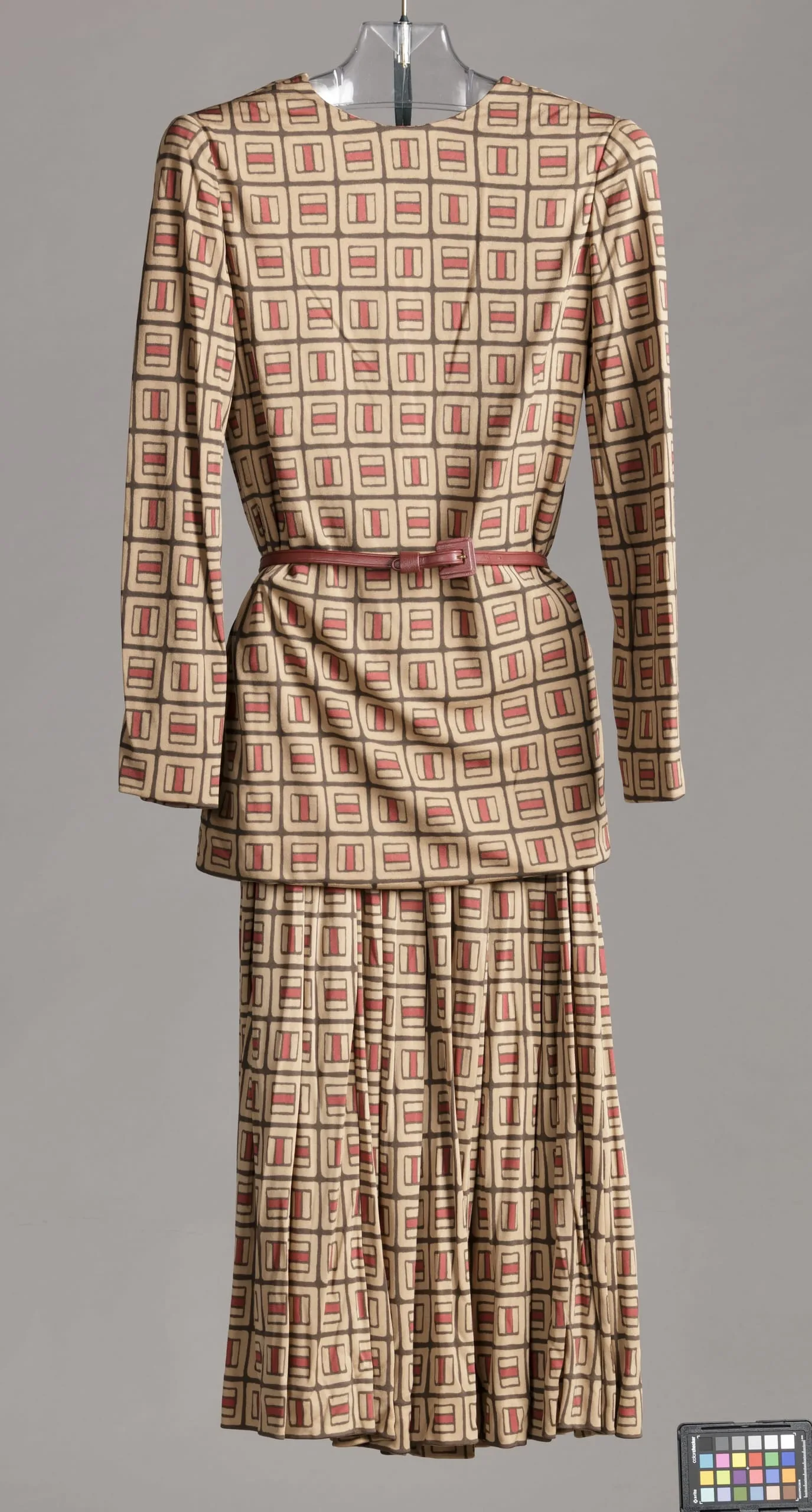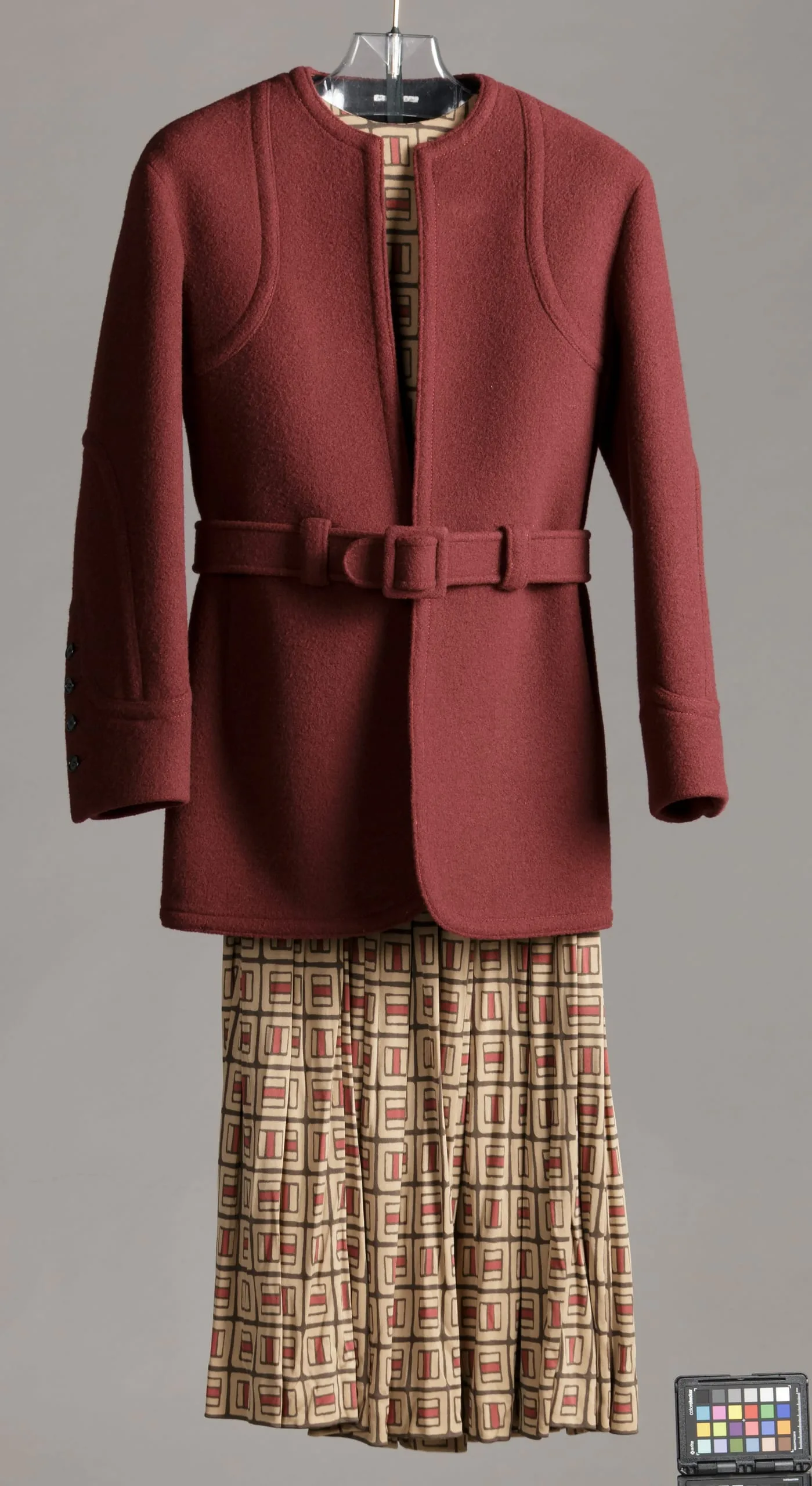- Coat and Belt: Wool plain weave, fulled; Blouse and Skirt: Silk knit (jersey), printed; Belt: Leather and metal