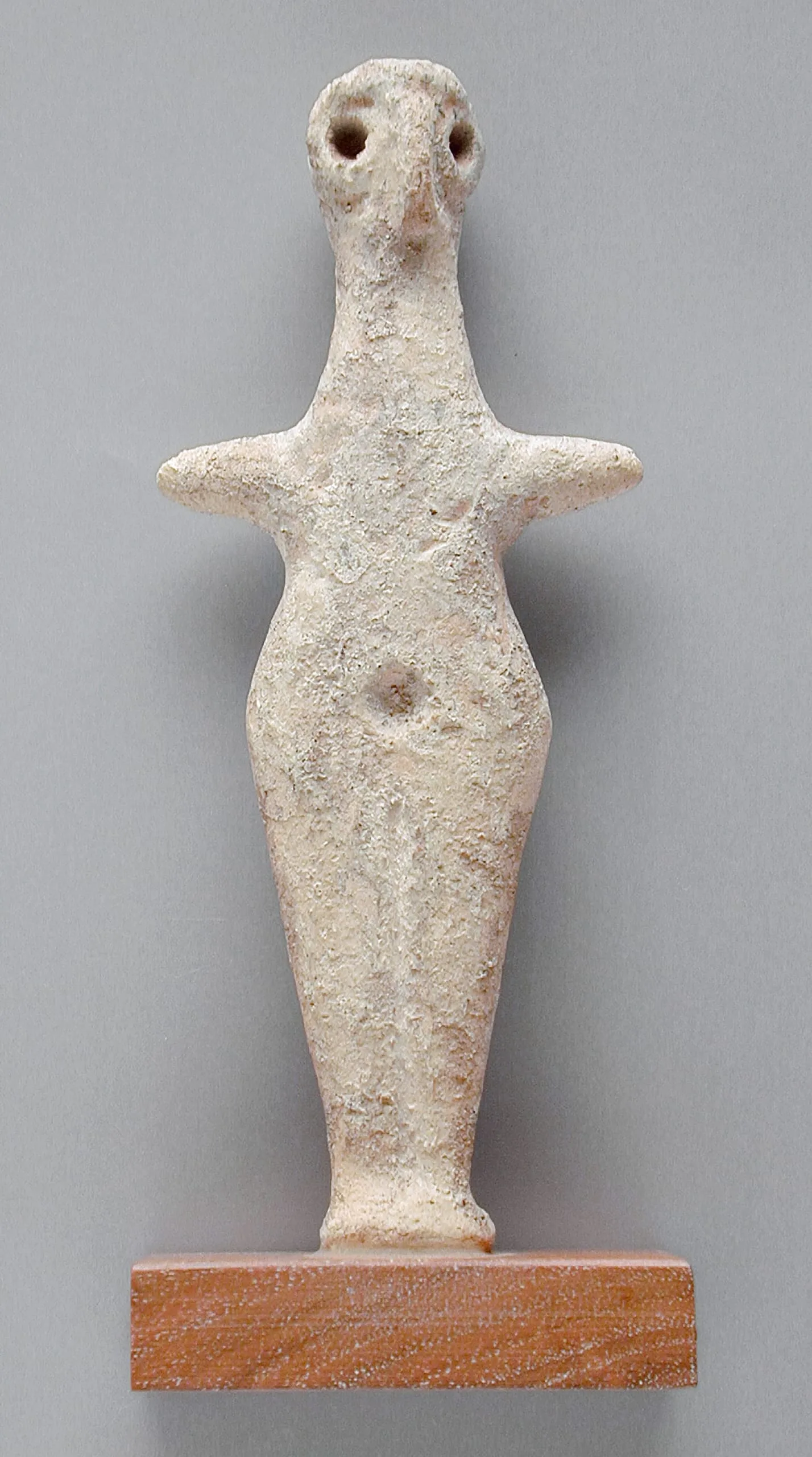 Small ancient ceramic figurine with a disk-shaped head pierced by two holes for eyes, stubby horizontal arms, and a tapering conical body, mounted on a wooden base