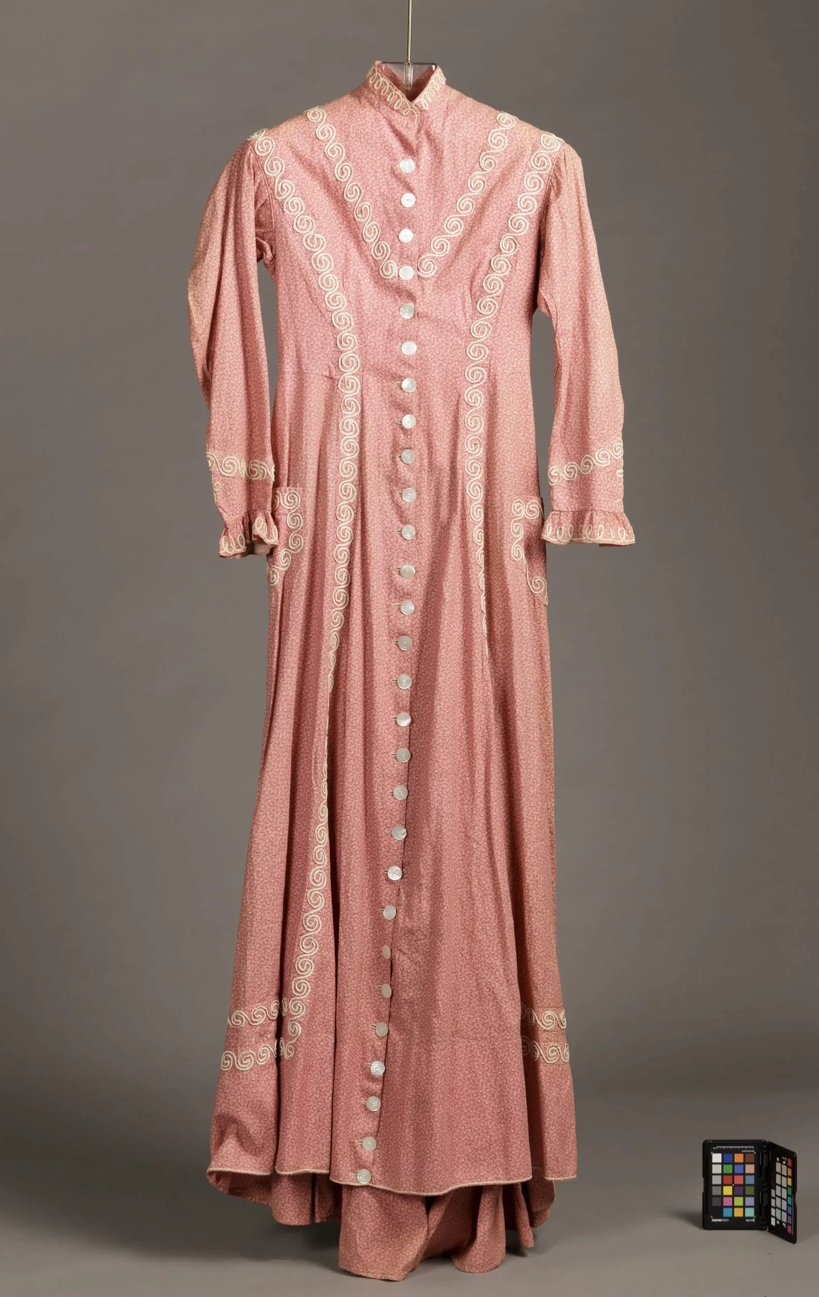 - Cotton plain weave, roller-printed, with cotton braid trim and mother of pearl buttons