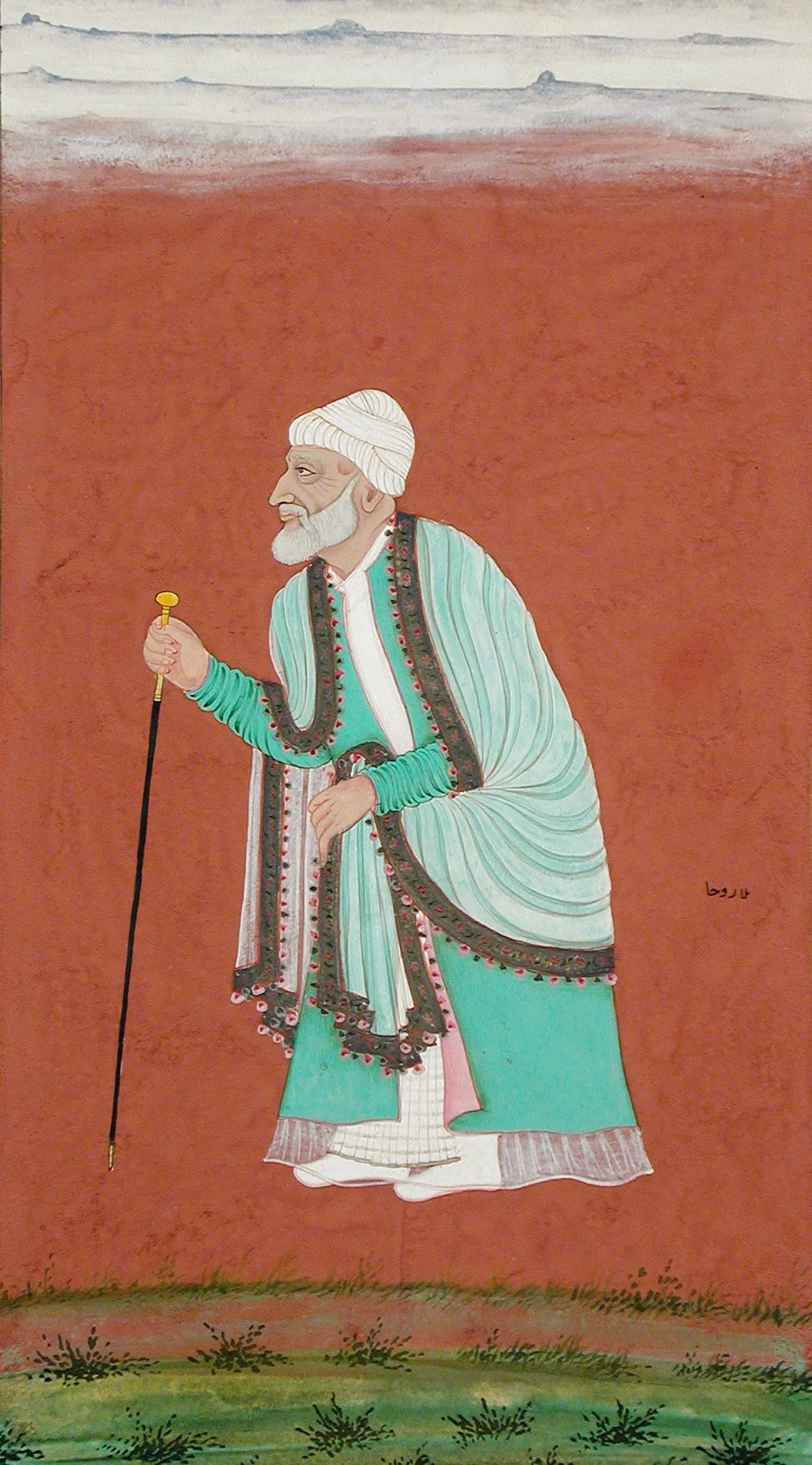 This portrait of a Muslim cleric or theologian (mullah) is identified by the inscription to the figure’s right as Mullah Raoza. On a reverse of the painting, an inscription in 19th-century English identifies the subject as Molla Roeha of Mal Rucha. Nothing further is known presently about either this mullah or the location. However, a mirror-image portrait from Golconda with an almost identical visage, garments, and posture is identified as Mullah Tayfur, the teacher (ustad) of Sultan Abdullah Qutb Shah (r. 1626-1672). It is one of forty-nine portraits in the Witsen Album acquired in 1686 by Nicolaes Witsen (1641-1717), now in the Rijksmuseum, Amsterdam (RP-T-00-3186-31). Numerous portrait sets of Mughal, Rajput, and Deccani rulers and important personages were produced in Golconda to introduce European textile traders to India.