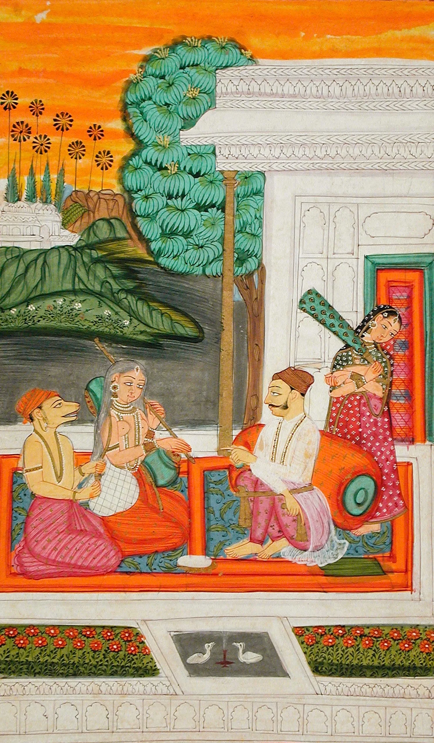 Here, Shri Raga is envisioned as a prince seated on a palace terrace listening to a musical performance. He is pointing at the musicians and keeping the rhythm with his left hand and holds a gold handkerchief in his right hand. The singer is Tumburu, a horse-headed celestial singer and musician (gandharva). A gray-haired female musician plays a vina in place of the more customary legendary poet-saint Narada. Behind the prince, an attendant holds an honorific peacock feather fly whisk (morchal). The painting is now cropped, but originally had a silver and red border. The bright orange sky at sunset, silhouetted Palmyra fan palm trees, and exuberant rock formations reflect stylistic assimilations from the pictorial landscapes rendered in the dominions of the Nizam of Hyderabad. See also M.70.59, M.73.59, and AC1999.127.27.