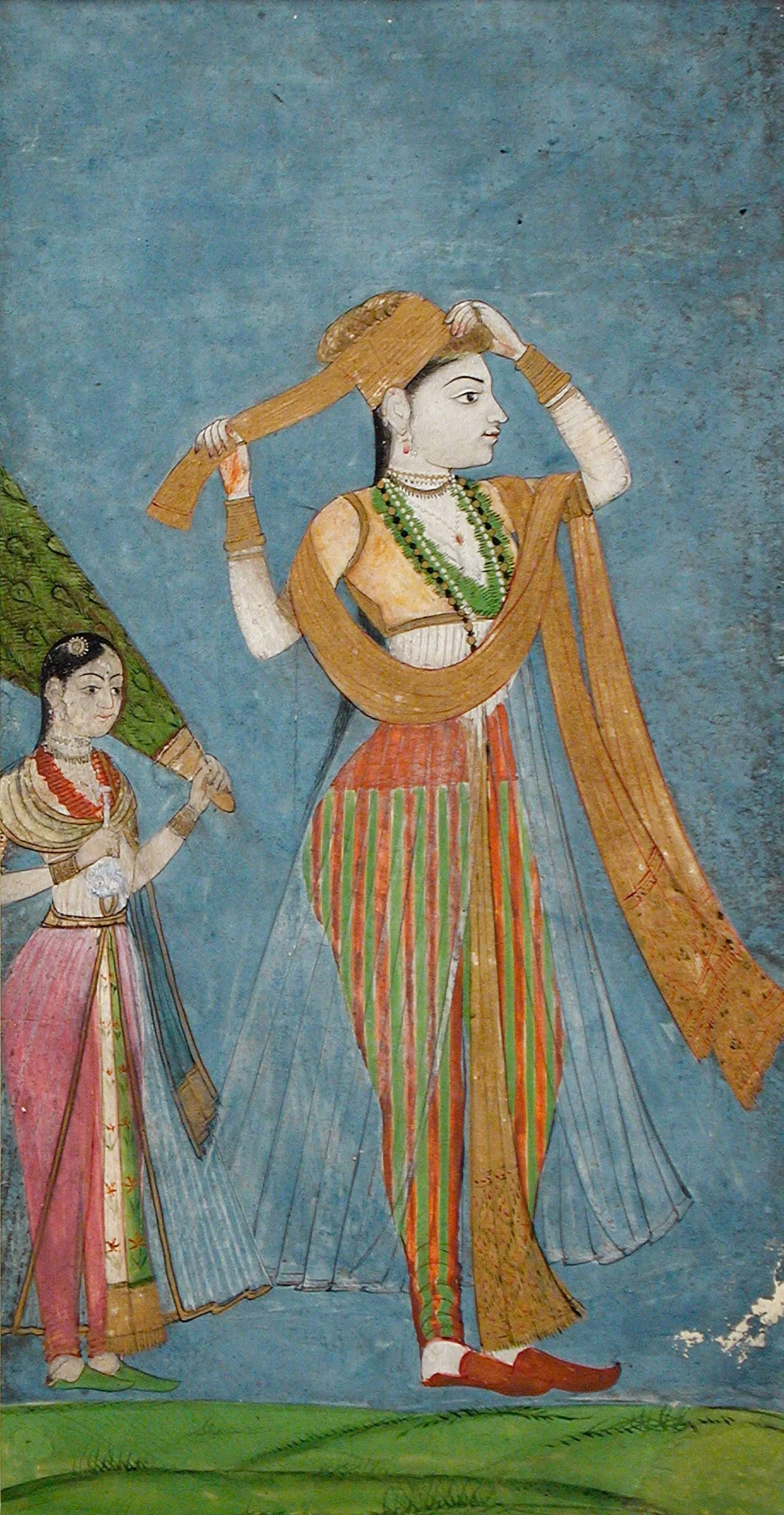 Genre scenes of elegant courtly woman were popular in Golconda in the late 17th–early 18th century. For example, see related Golconda portraits in the Metropolitan Museum of Art, New York (2011.585), San Diego Museum of Art (1990.489), and the Cincinnati Art Museum (1991.139). In this painting, an elegantly attired princess is wrapping her golden turban while accompanied by a maidservant. She wears a matching scarf with brocade ends, a long transparent outer garment over a bodice and red-and-green striped pajamas, and red shoes. Her long hair is braided. She wears golden rings, bejeweled earrings, and several types of necklaces, including golden chokers, strands of pearls, and a green floral garland (mala). Her attendant wears similar garments and jewelry, with the addition of a hair ornament (jada billi) and cuff bracelets. She holds an honorific peacock feather fan (morchal), symbolic of royalty, and a blue-and-white ceramic wine flask (surahi), which is a common courtly attribute. The figures are placed against a descendent Mughal-style landscape with a plain blue sky and green groundline.