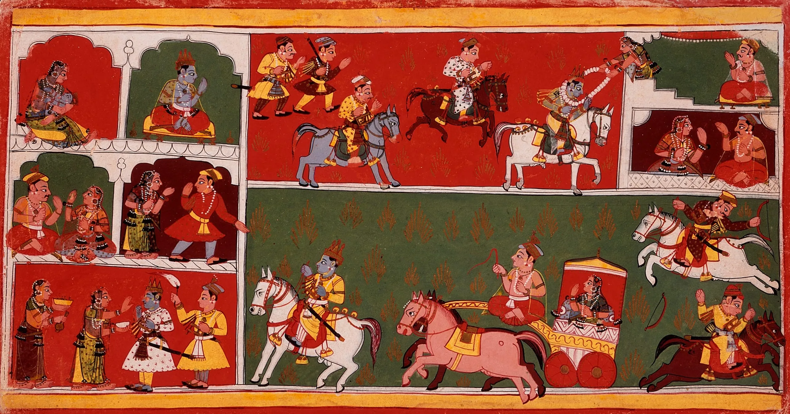 In this folio [# effaced], the action unfolds in continuous narration. In the upper left corner, Krishna is being suckled by his foster-mother Yashoda. The Braj text on the reverse is yet to be translated and may relate to an adjacent folio, so the identification of the remaining scenes of Krishna’s life are tentative: Krishna receives an oblation, perhaps fragrant ointment from Kubja (lower left corner); Krishna on horseback receiving a garland, perhaps at the house of the garland-maker Sudama (center upper register); and Krishna on horseback leading a chariot with a woman, and two mounted archers (lower register).