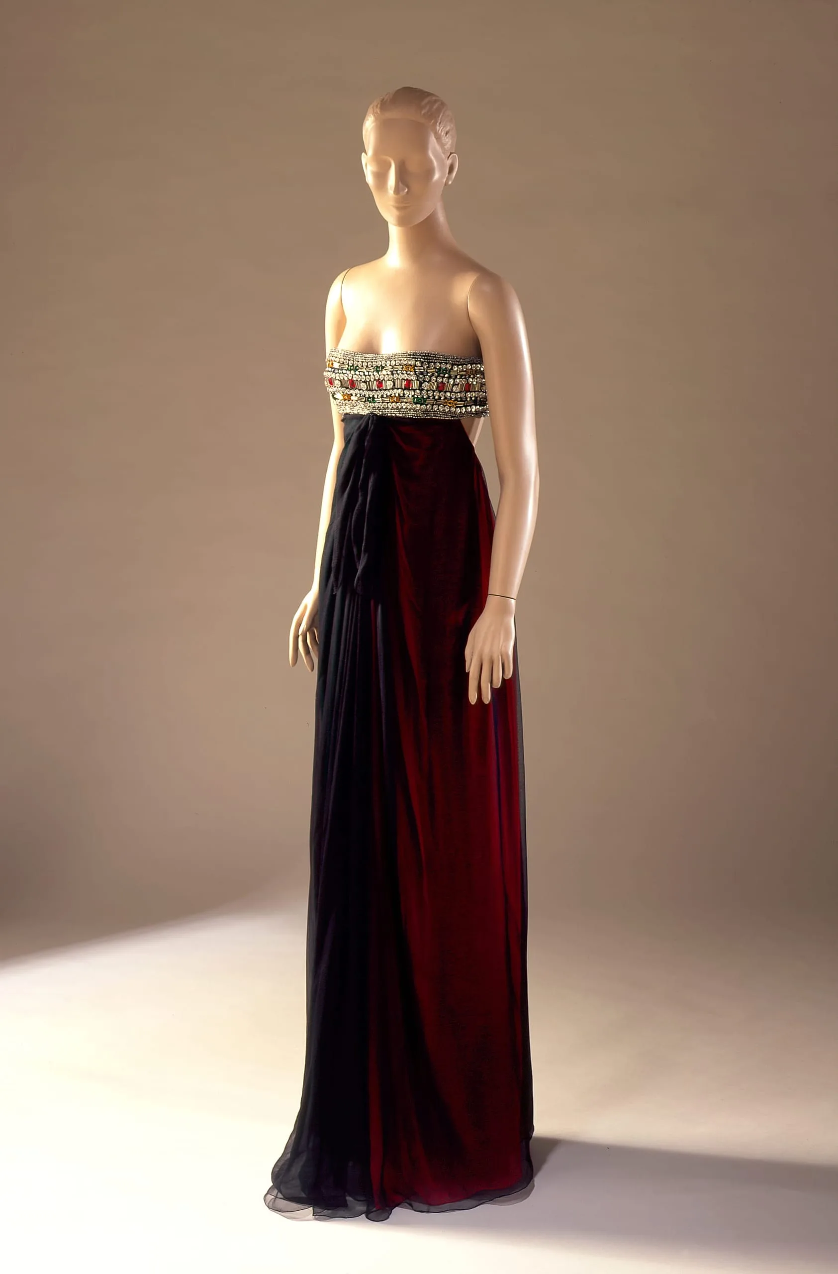 - Silk plain weave (crepe chiffon) and silk plain weave (crepe), with crystals, glass beads and metallic thread