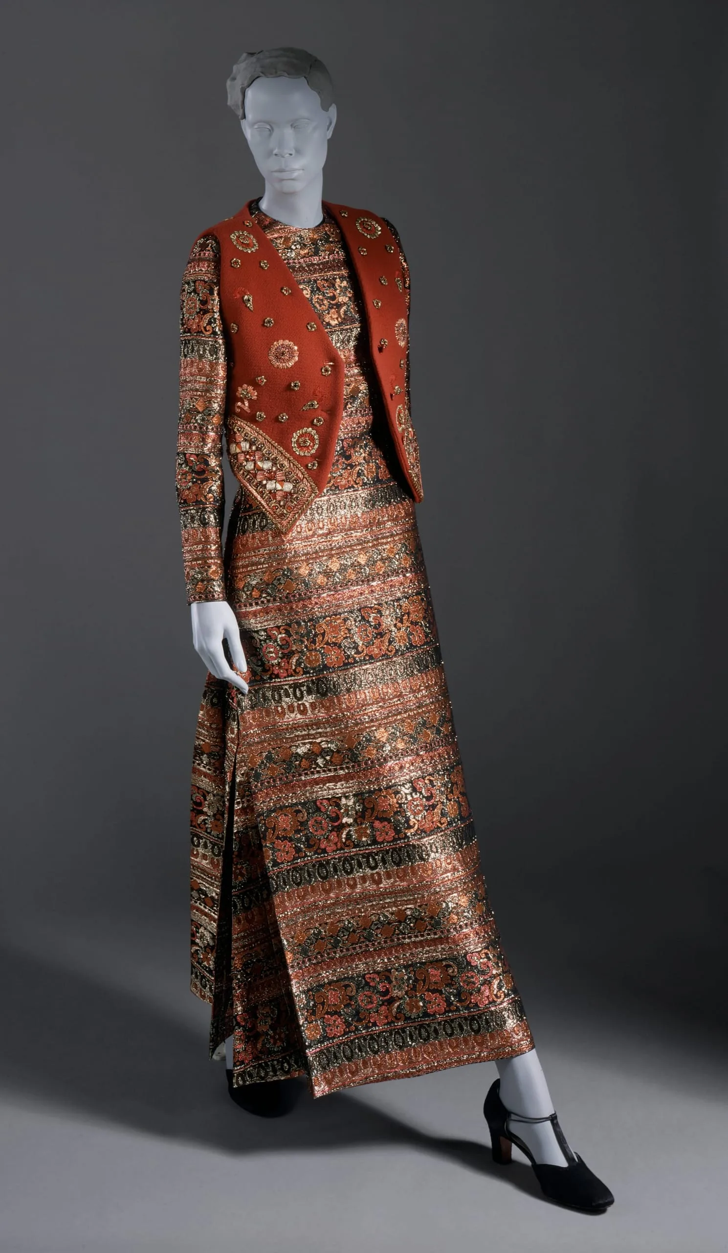 - Dress: Silk plain weave with lame supplementary weft patterning