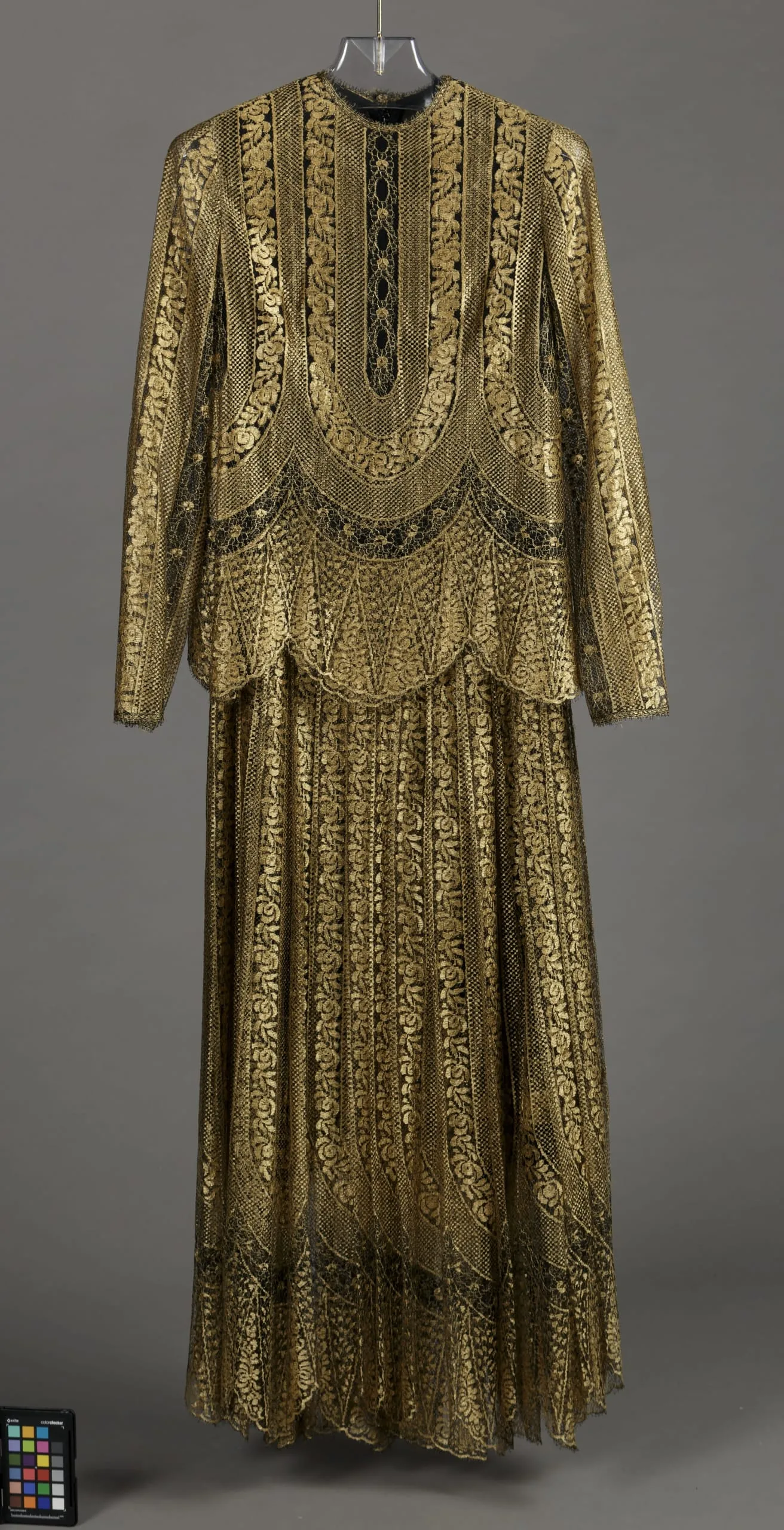 - Dress: Silk machine-made lace; Sash: Silk satin