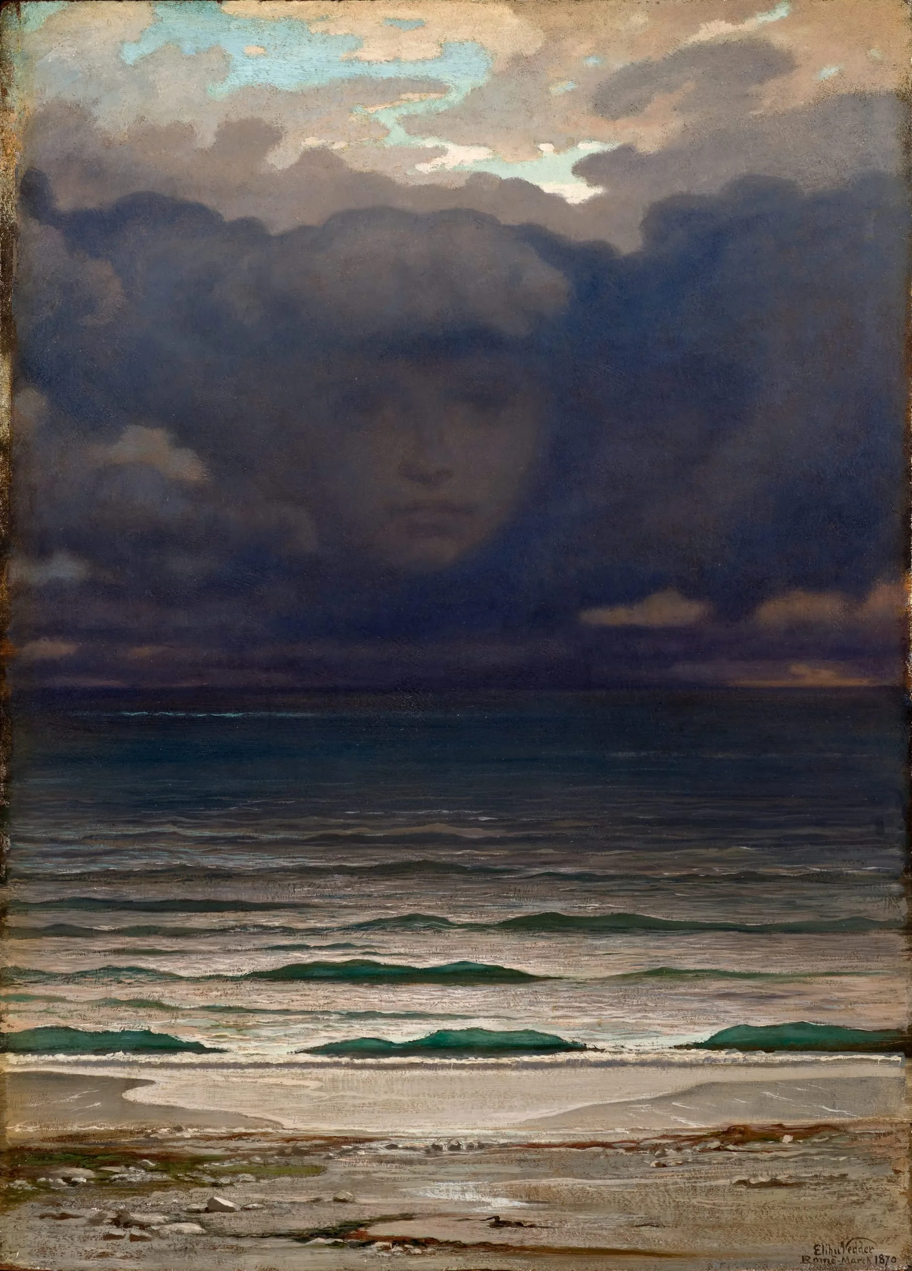 Memory is one of Vedder’s most symbolic paintings. Although it at first appears to be a straightforward nocturnal view of the beach and ocean, upon close scrutiny one sees a faint human face emerge in the cloudy sky. Similar images of a floating head appear in a group of Vedder’s drawings from the late 1860s. Later he would be fascinated by the related classical motif of the head of Medusa. The theme of floating and severed heads was popular with the English Pre-Raphaelites, and at the end of the century it became a characteristic motif of the symbolists. Artists used such imagery to suggest states of mind and ideas of a personal nature rather than to describe the material world.