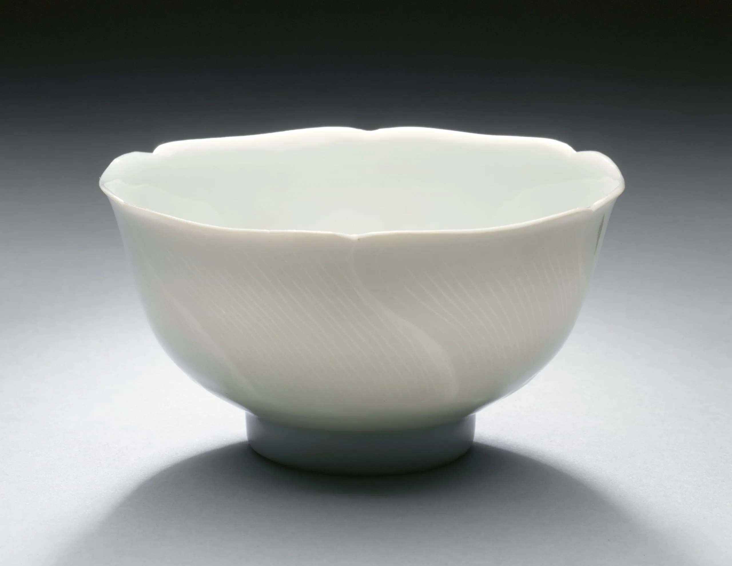 - Wheel-thrown porcelain with incised decoration and clear glaze