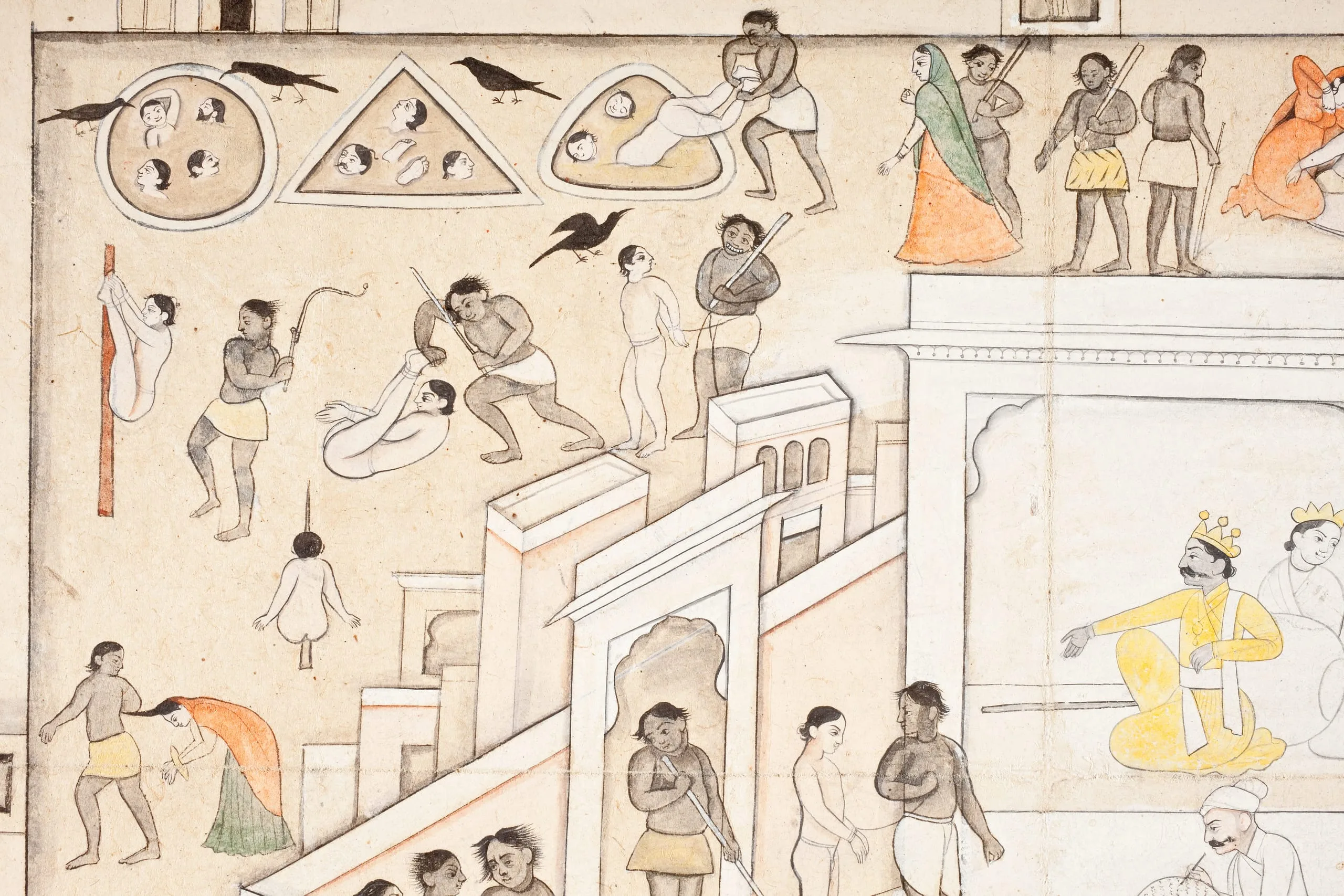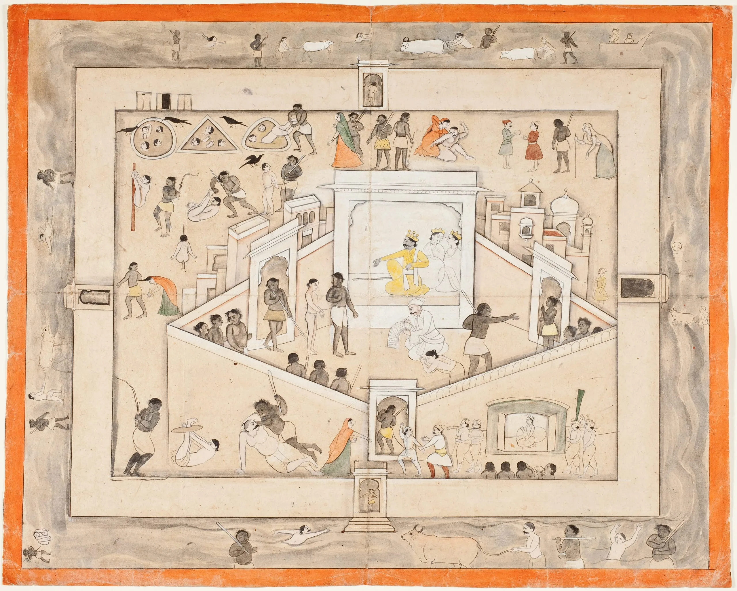 Yama is the Hindu God of Death. He rules over hell (naraka) where he judges the souls of the dead and punishes sinners. He is also the guardian of the direction (dikpala) of the South. Here, the crowned Yama sits in a pavilion in his Kalichi Palace presiding over hell. His right hand is held in the symbolic gesture of ‘gift-giving’ (varada mudra). Beside him is his primary attribute, his staff (yama-danda), representative of Yama’s chastisement. In front of him is a scribe who reads aloud each sinner’s deeds and misdeeds before judgment is rendered. Depending upon their actions, souls are consigned to hell, sent back to be reborn on earth, or admitted to Pitriloka, the nether-world realm of the ancestors. In the compound surrounding Yama’s palace are numerous scenes of sinners being tormented or tortured by Yama’s demonic servants. Outside of the compound are subterranean waters with more afflicted souls and bovines.
