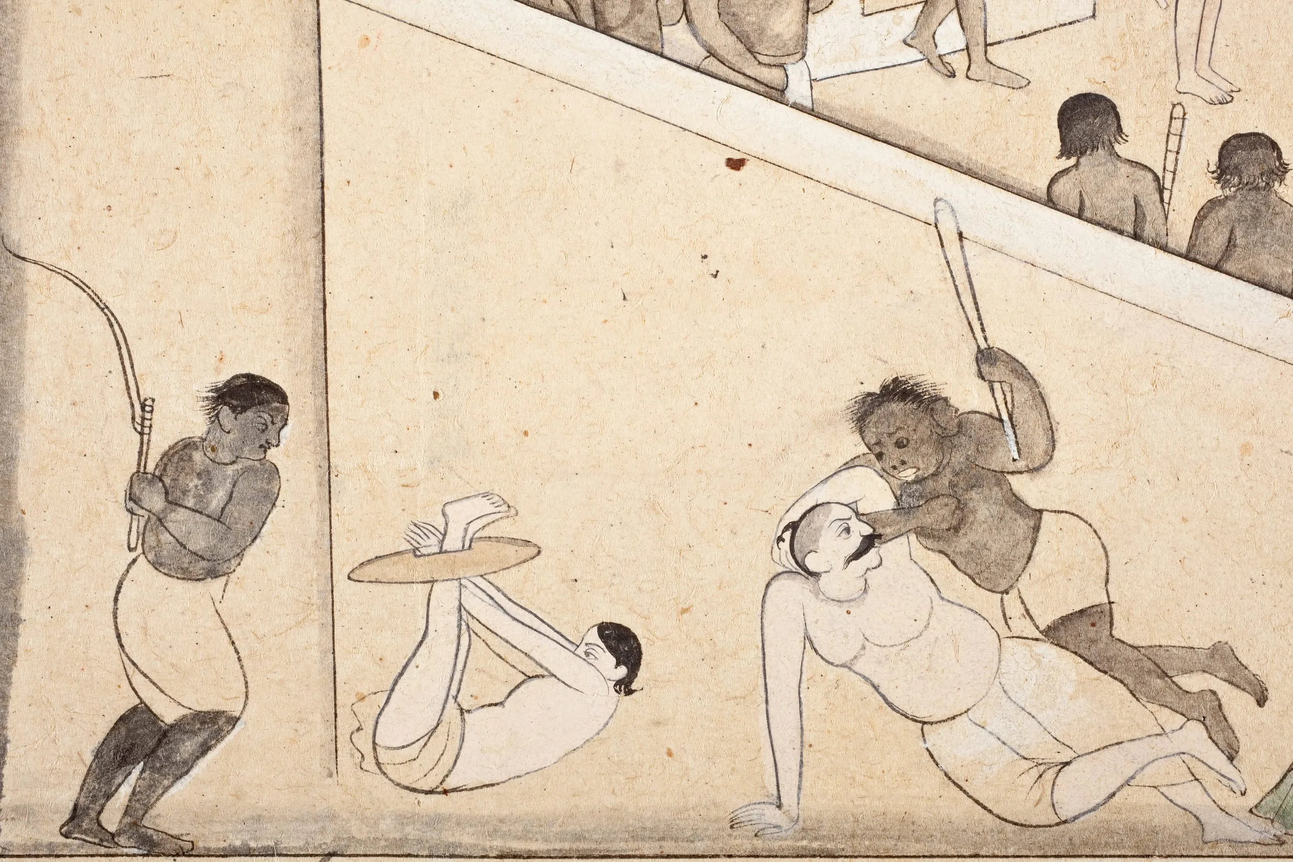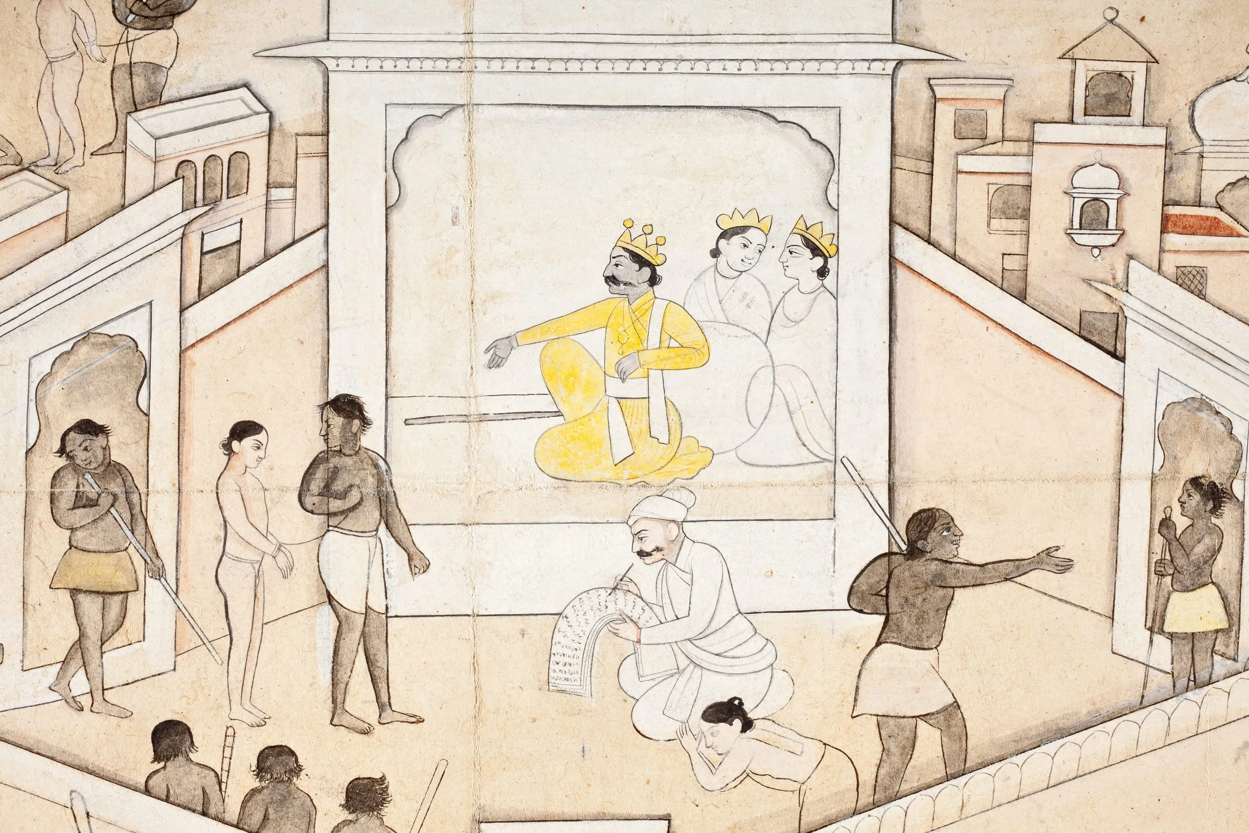 This folio has been attributed by B. N. Goswamy to Gursahai (active circa 1800-1830). Gursahai was the eldest son of Ranjha (active circa 1778-1827) and grandson of the celebrated artist Nainsukh of Guler (circa 1710-1778, active circa 1730-1778). The angular architecture and geometric composition typify Gursahai’s artistic style.