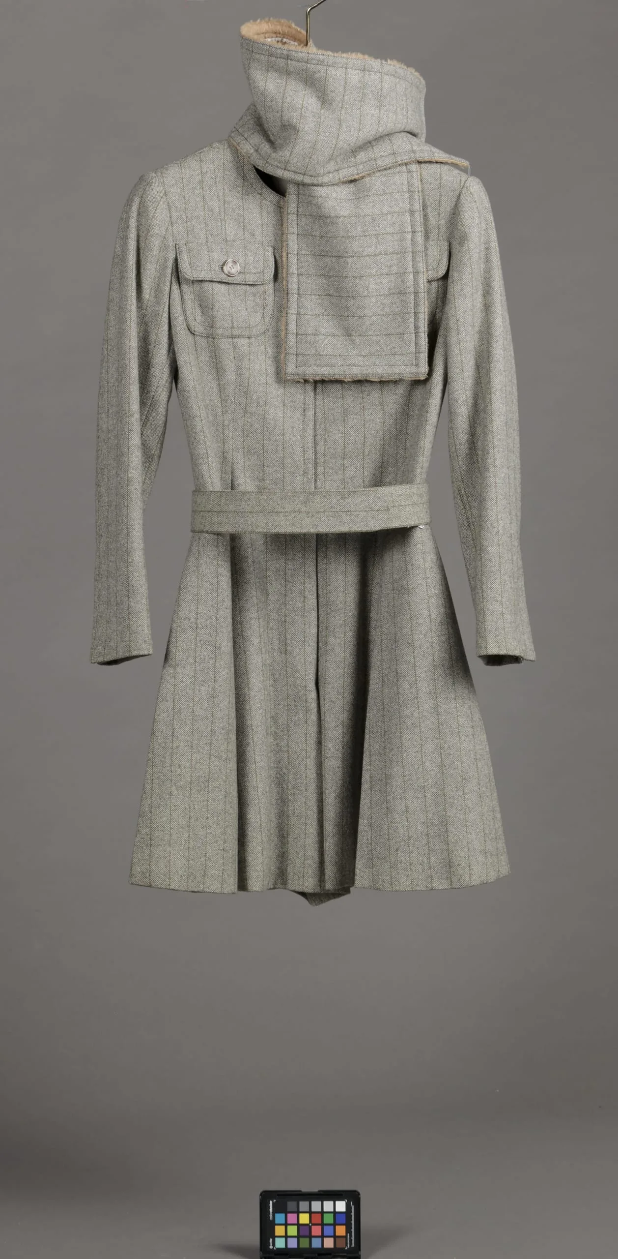 - Dress: wool twill; Scarf: wool twill and synthetic mohair