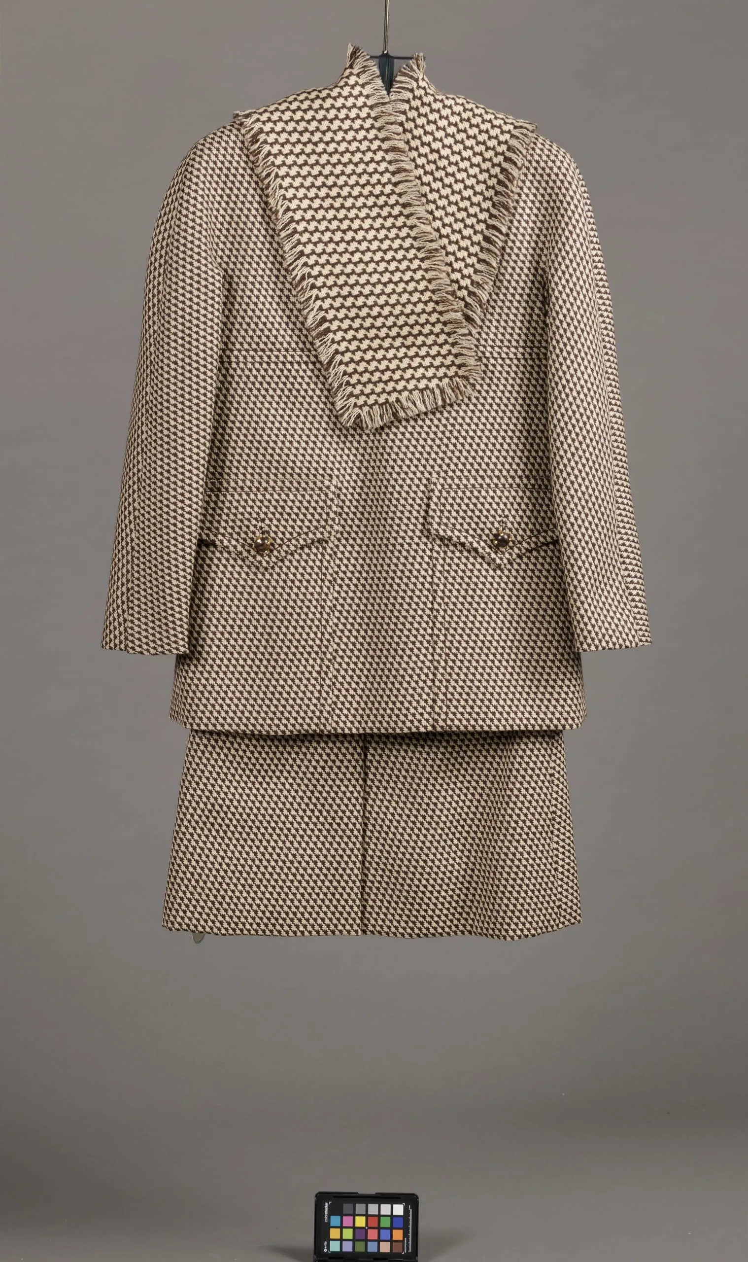 - Jacket: Wool twill, wood and metal buttons; Skirt and Scarf: Wool twill