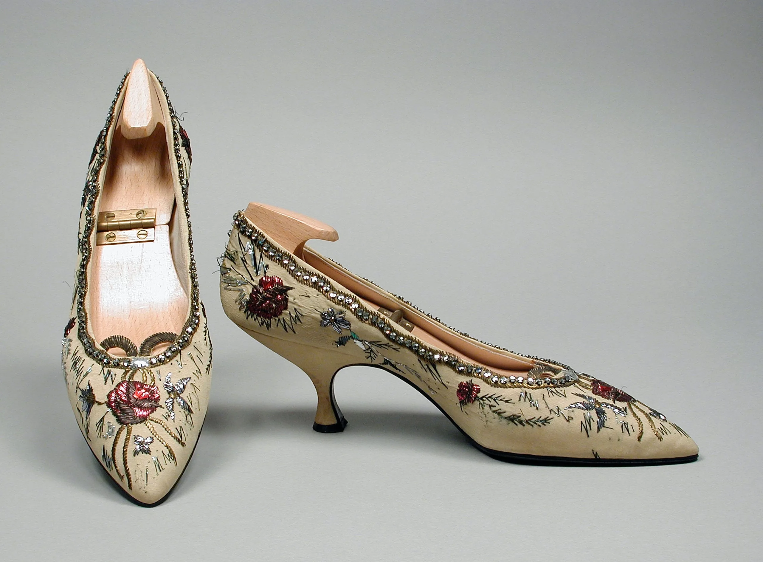 - Silk plain weave (faille) with metallic thread embroidery, paste stones and leather