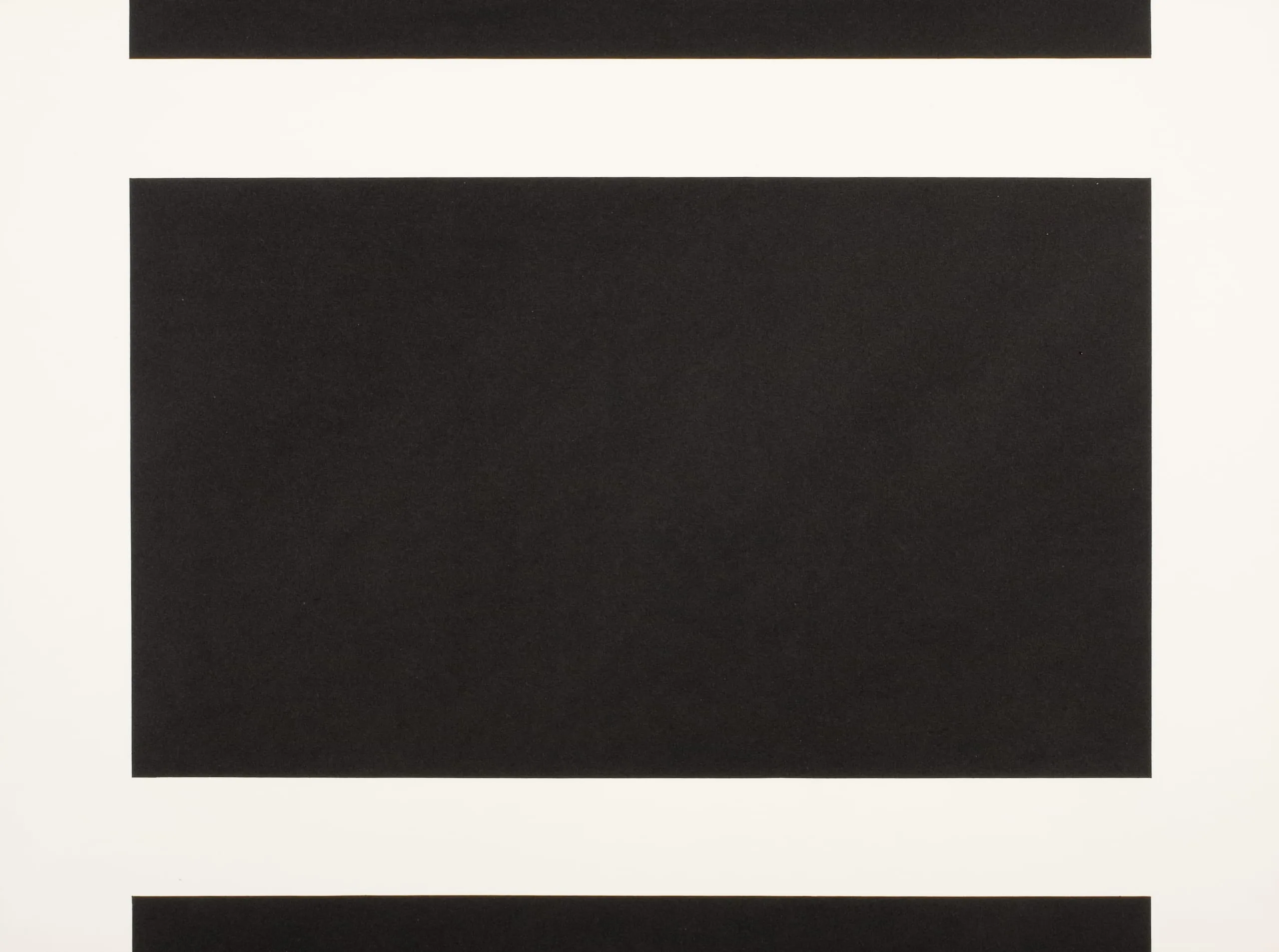 Abstract painting with three flat black horizontal rectangles on a white ground, the largest centered with white margins on each side