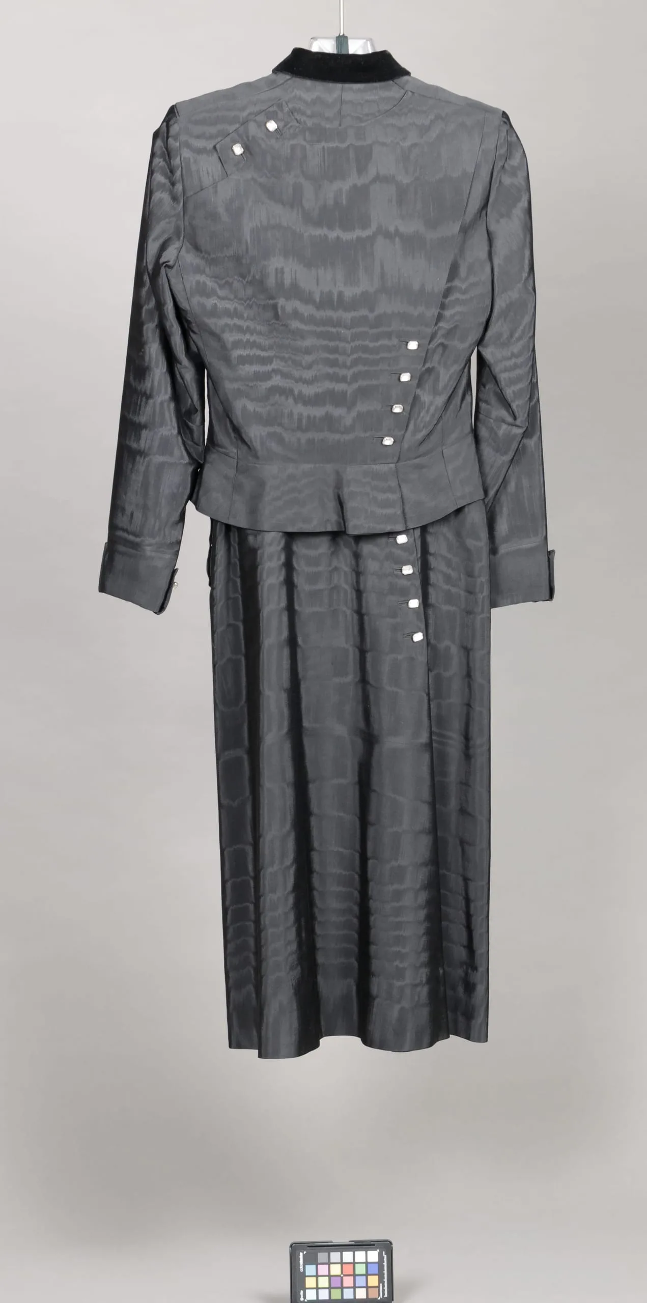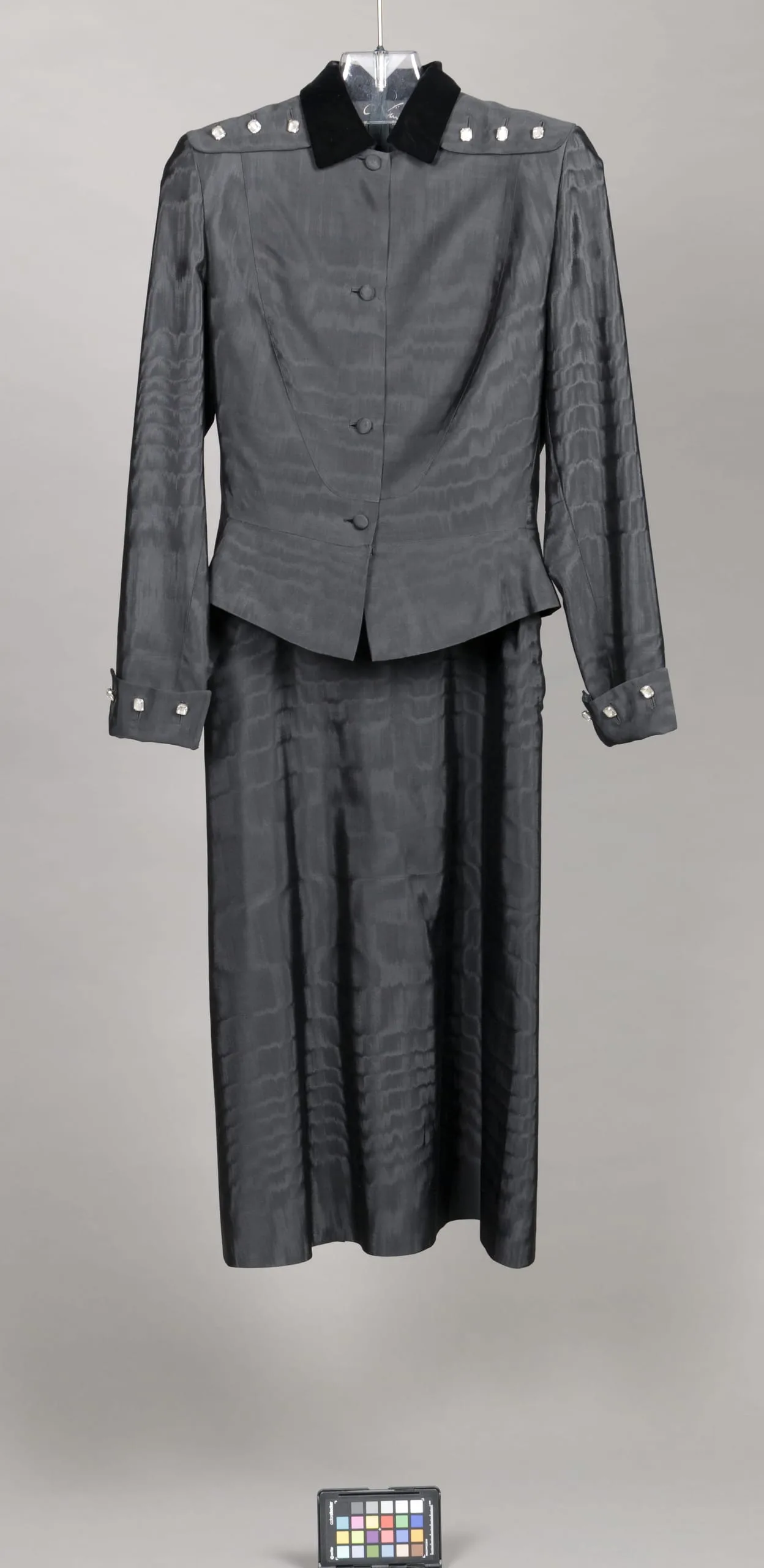 - Jacket: Silk/wool faille (moiré), silk velvet, crystal buttons