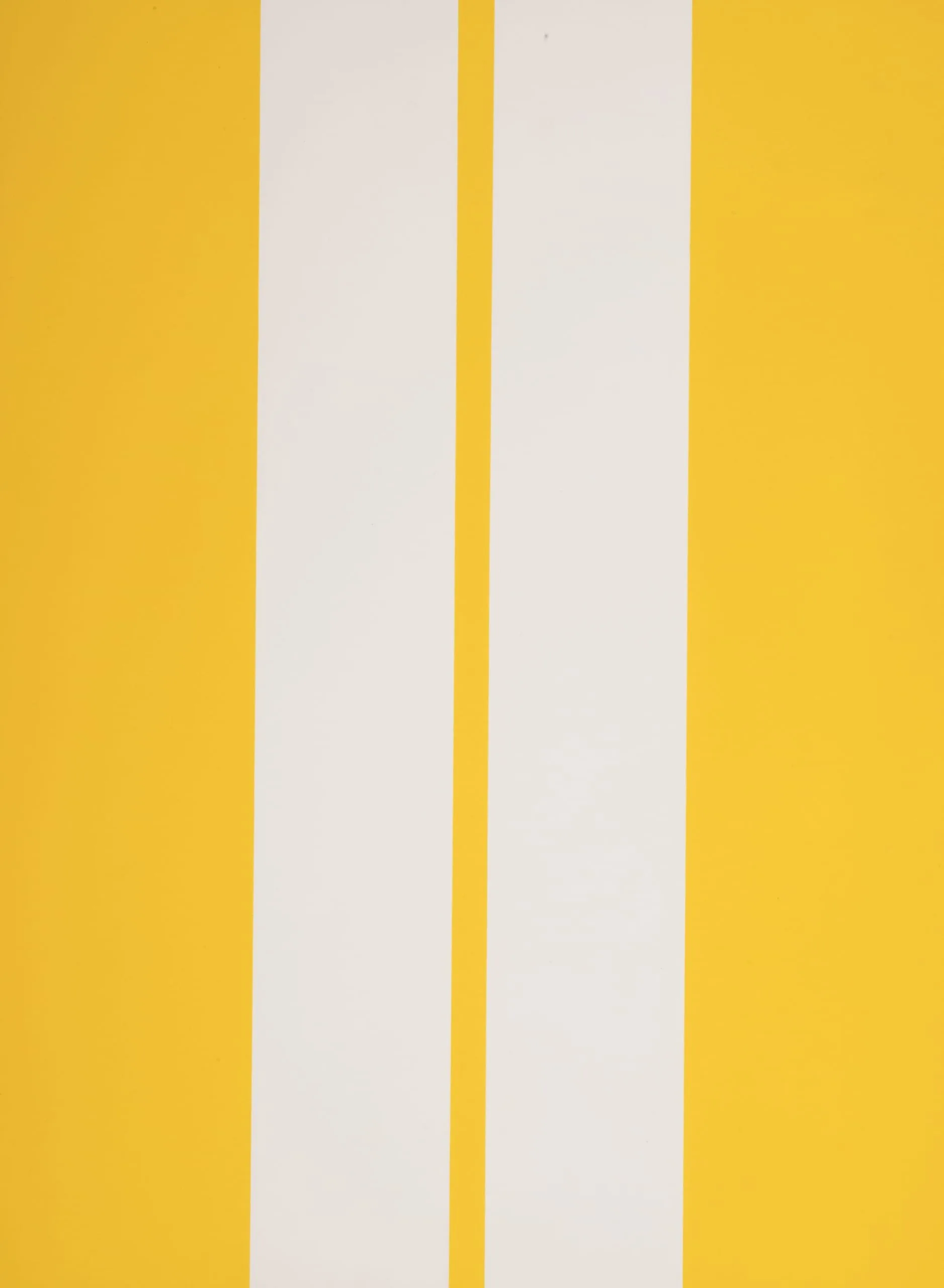 Abstract vertical painting with two wide off-white stripes running top to bottom against a flat golden-yellow ground, separated by a thin yellow gap