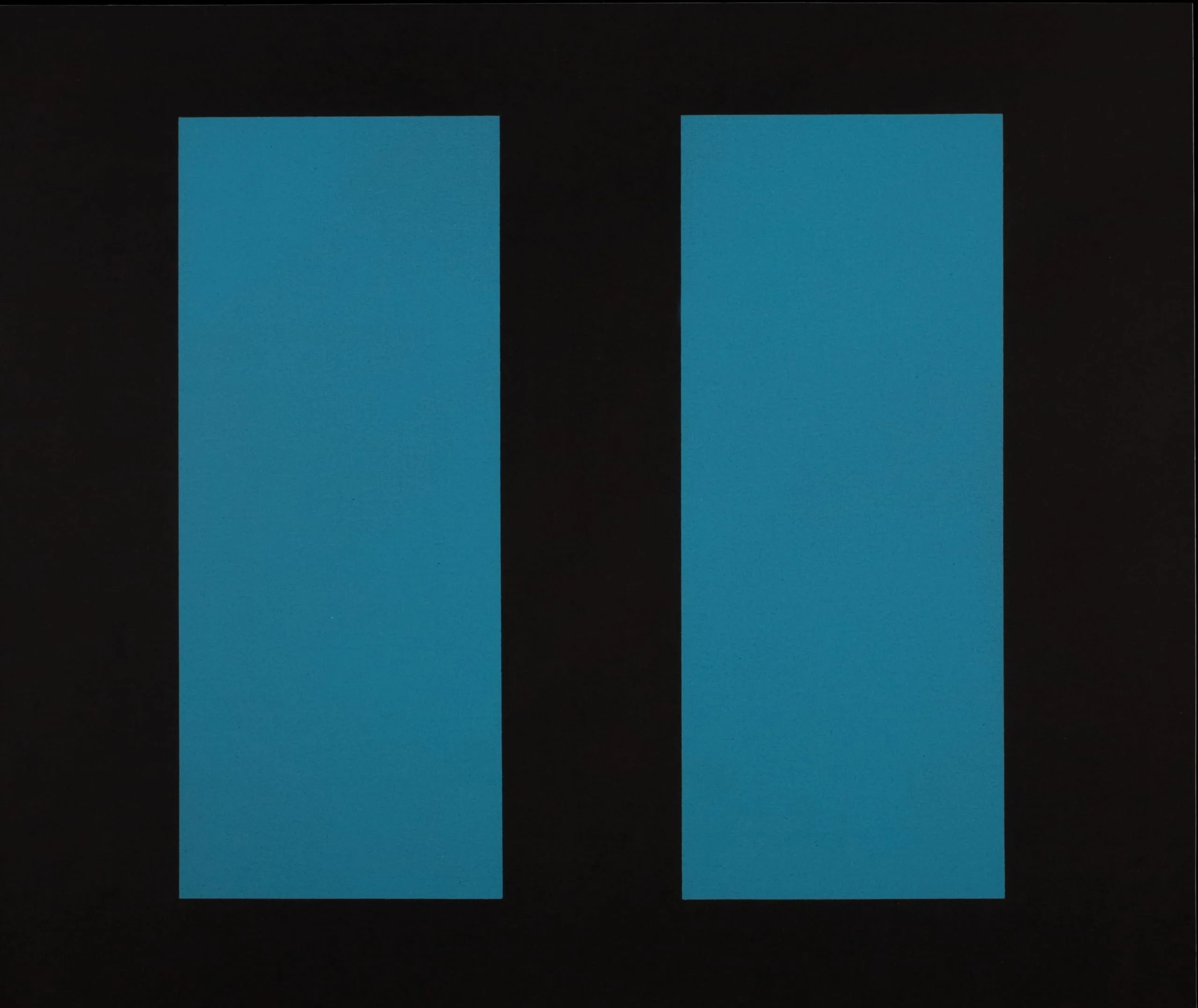 Abstract painting with two tall, flat cerulean blue rectangles side by side against a near-black background, hard-edged and evenly painted