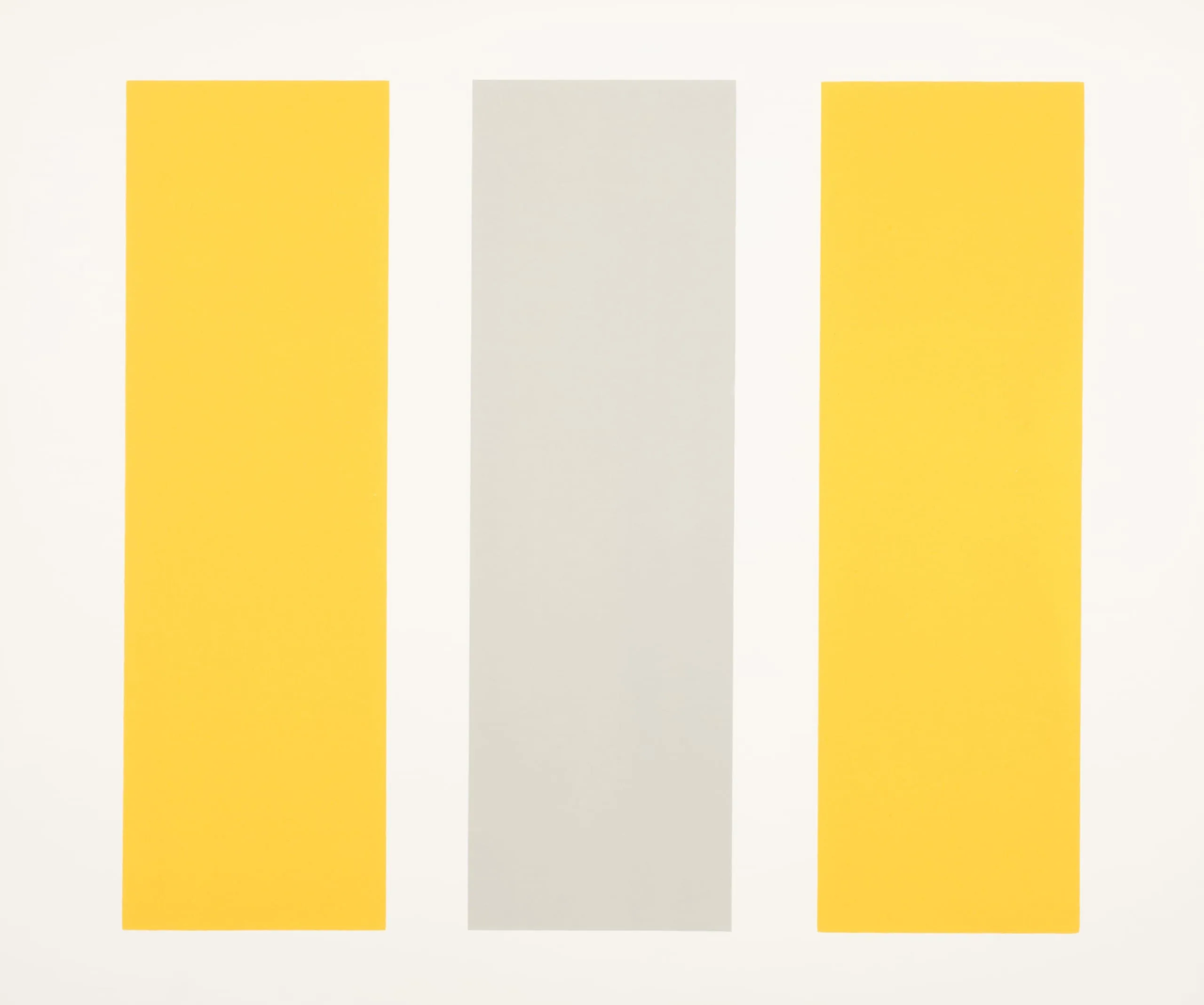 Abstract horizontal painting with three vertical rectangles — two sunflower yellow on the outer sides and one pale gray in the center — against an off-white ground, with hard edges and flat color
