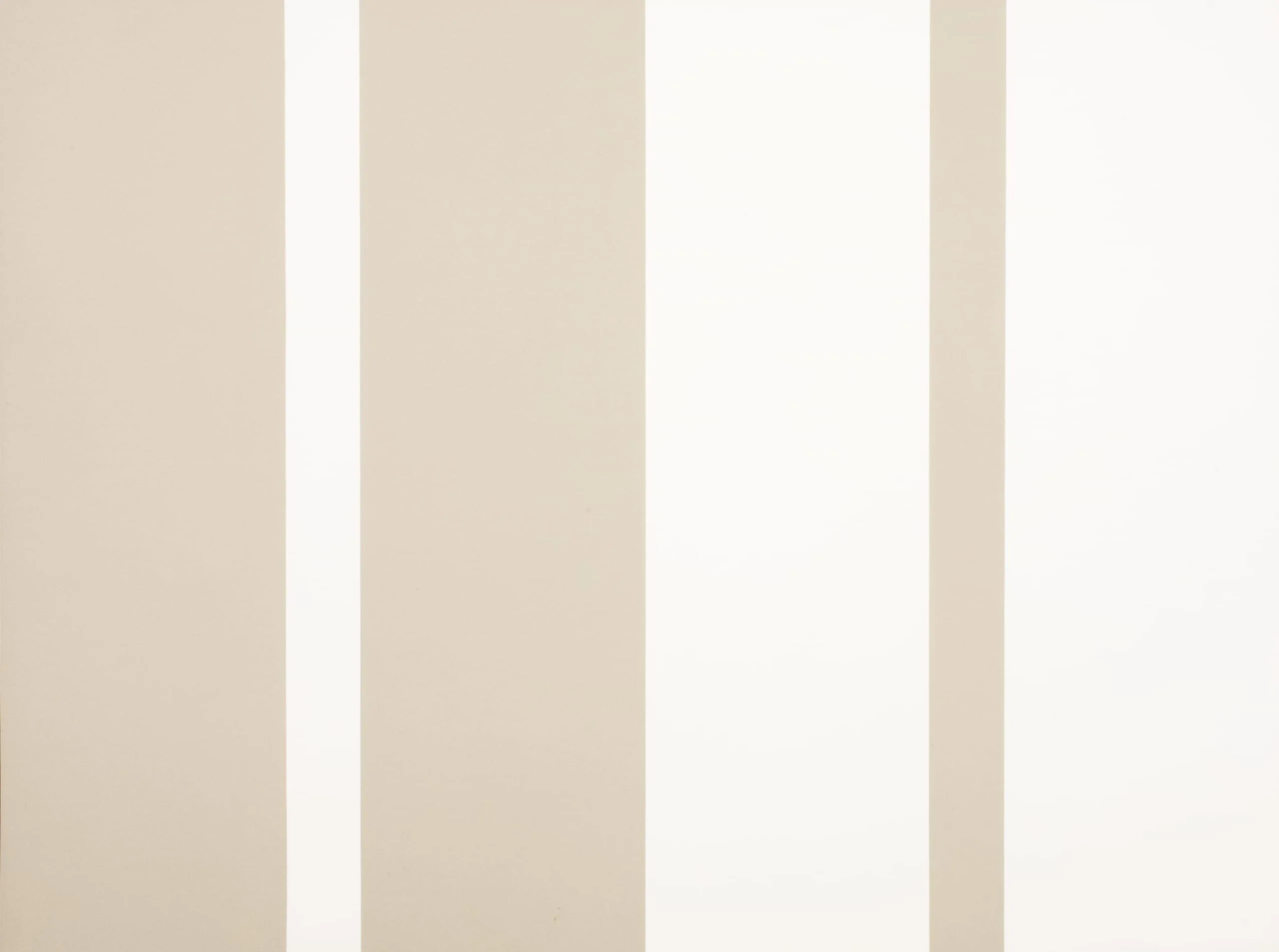 Horizontal abstract painting with vertical stripes of warm sand-beige alternating with narrow and wide white bands, hard-edged and smoothly painted