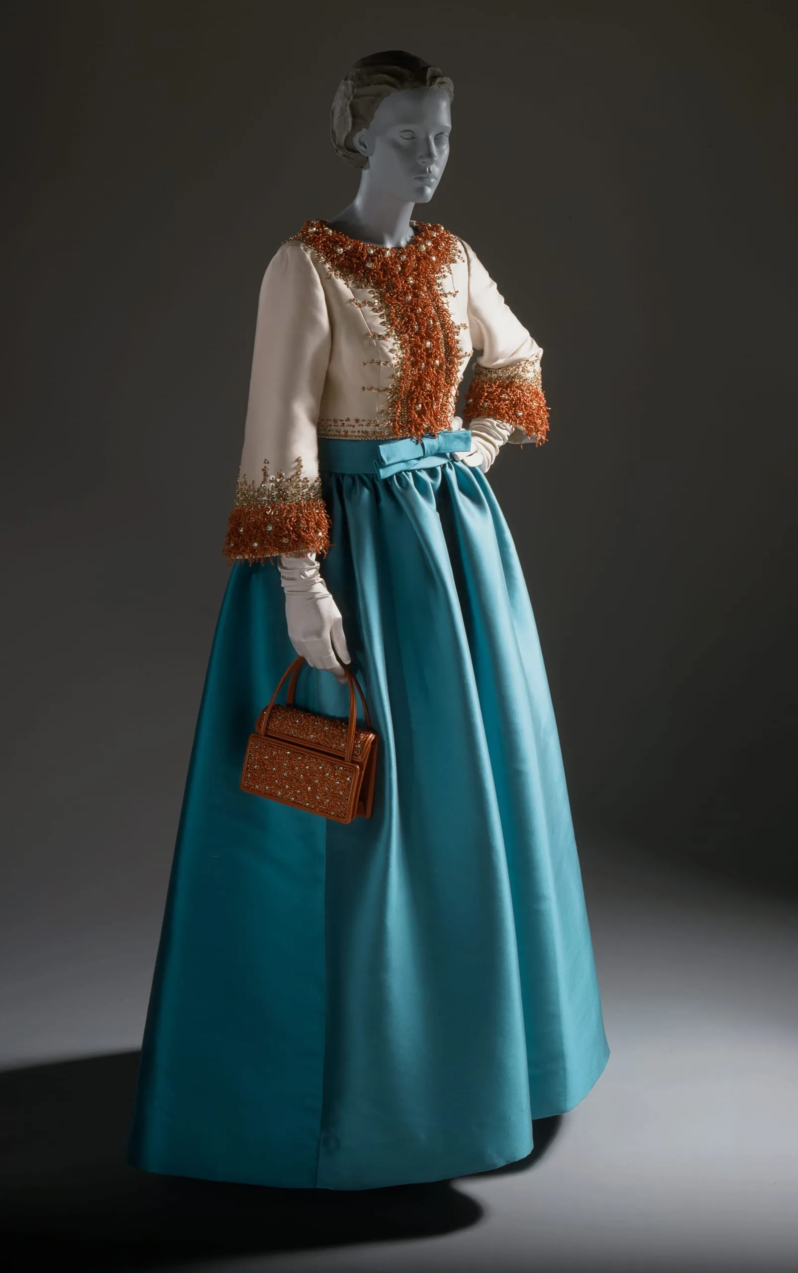 - Silk twill with plastic beads, faux pearl beads, and plastic sequins.