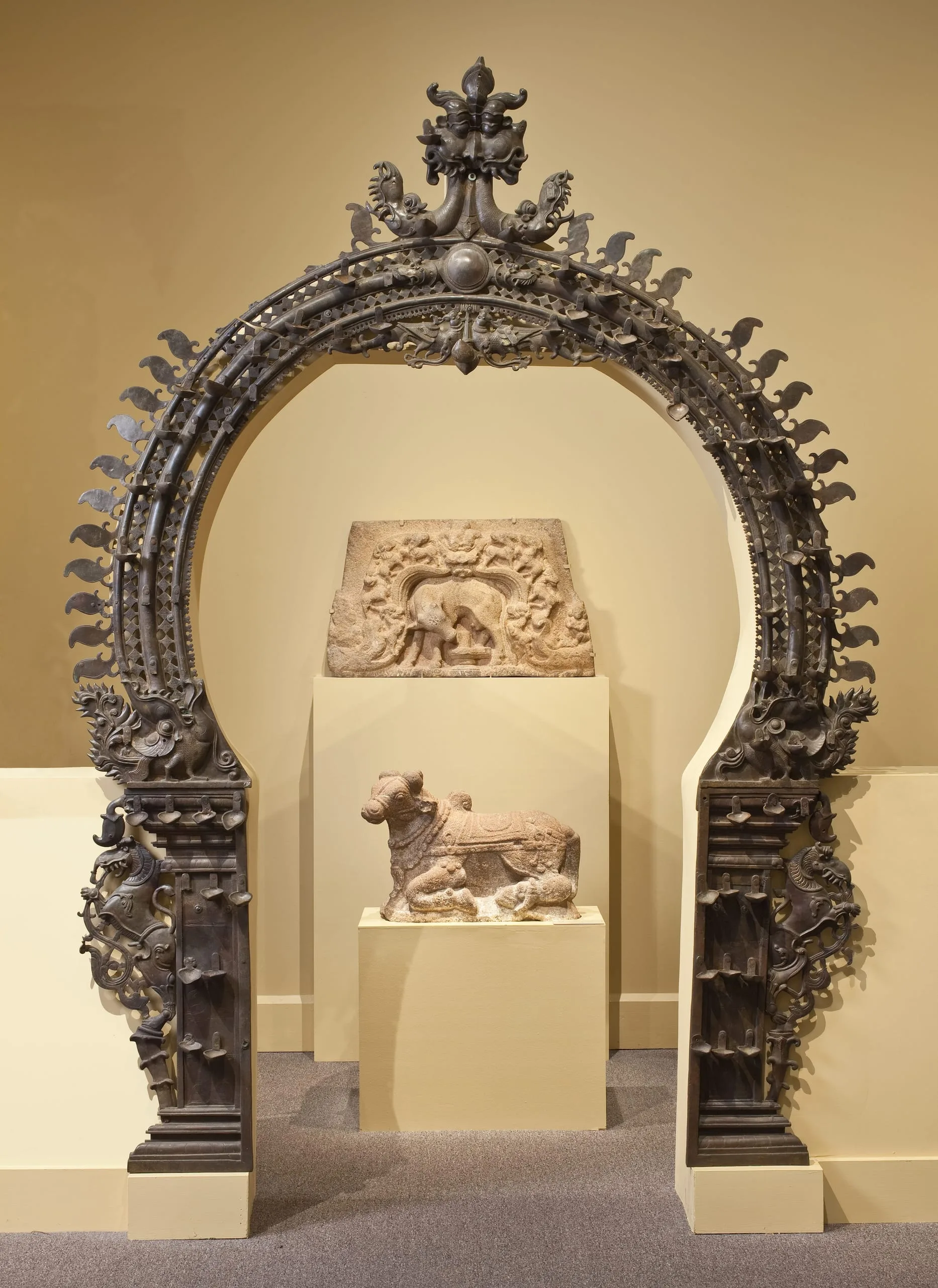 - Temple Archway with Oil Lamps and Auspicious Animals