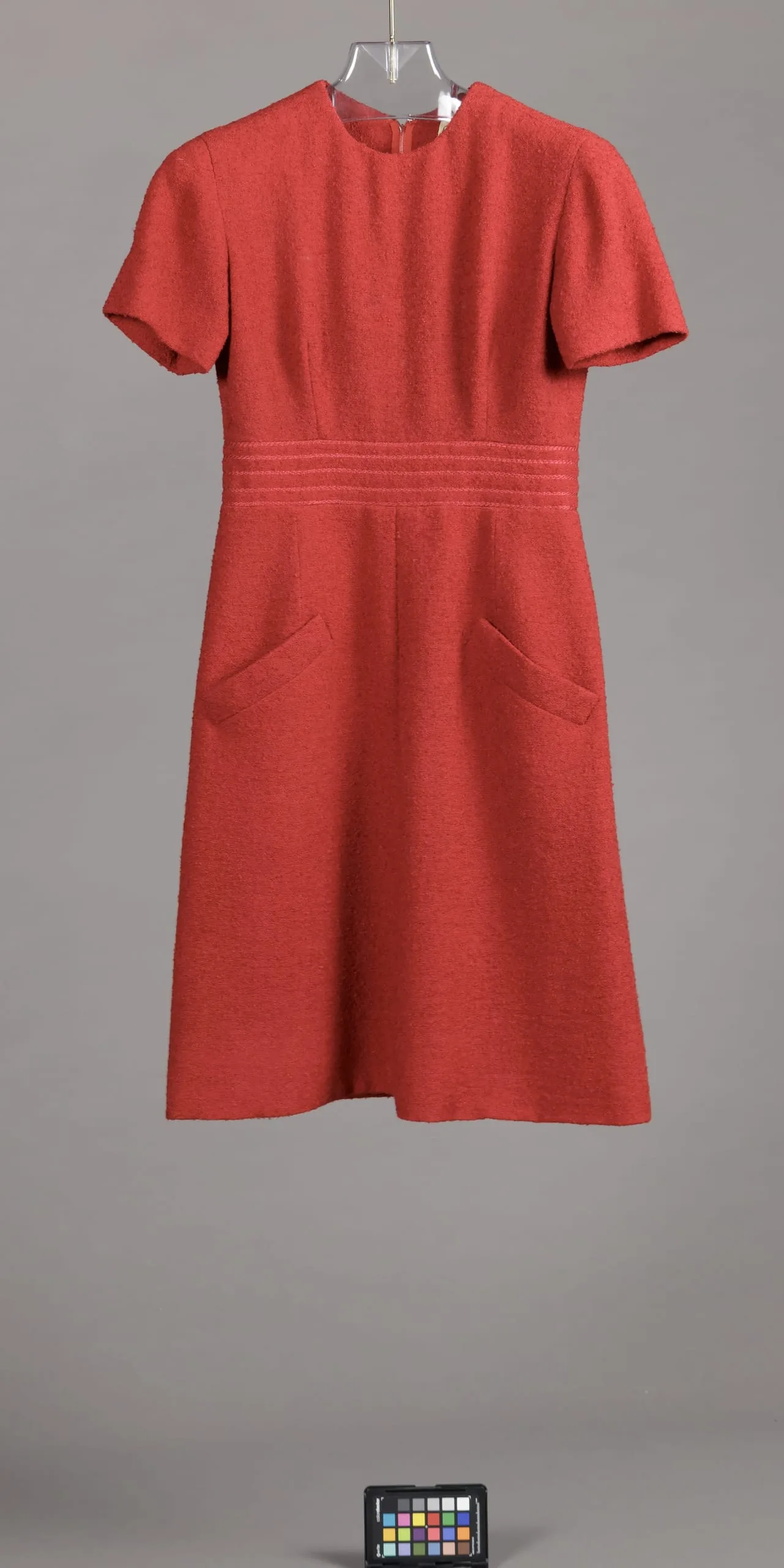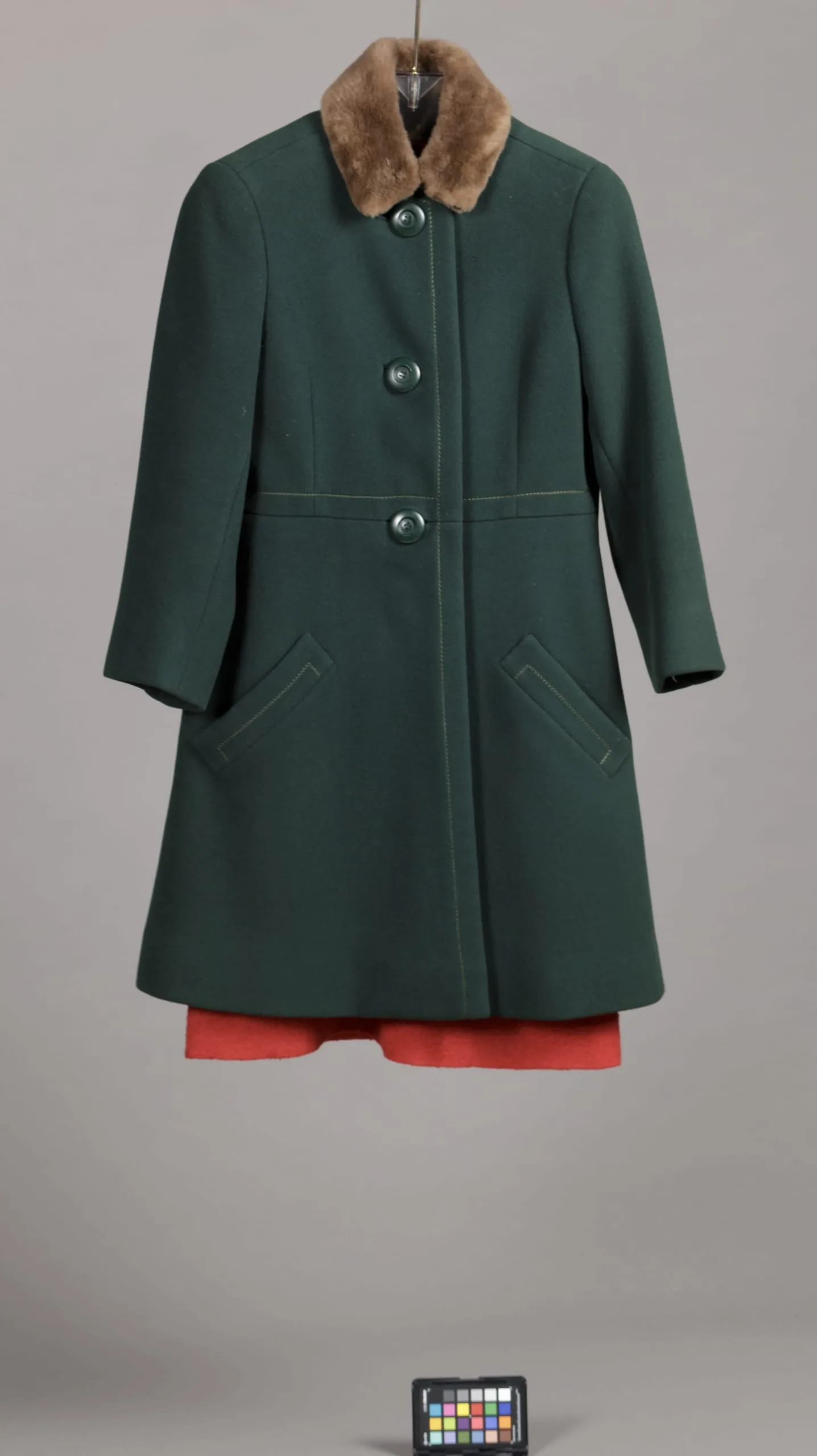 - Coat: Wool, fulled, beaver fur, plastic buttons; Dress: Wool plain weave, bouclé.
