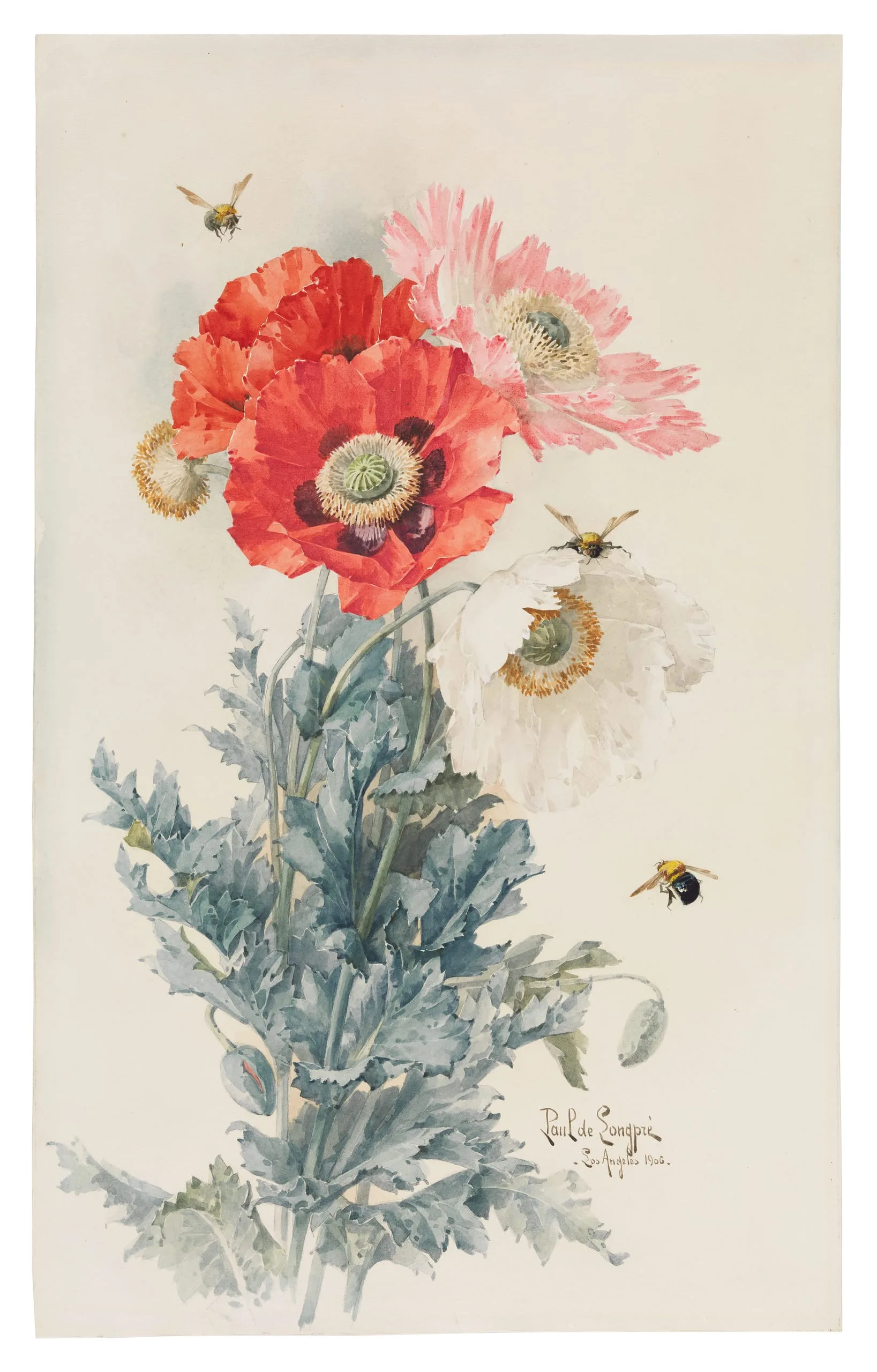 This watercolor is characteristic of de Longpré’s mature flower paintings. Focusing on one or two stalks with buds and flowers, de Longpré isolated the arrangement by leaving the background white. Such a treatment and use of watercolor as a drawing medium relate to traditional botanical renderings (which de Longpré studied while working with a French horticulturist named Paillet). The poppy, the state flower of California, shares with the rose, for which de Longpré is better known, many characteristics that appealed to the artist, namely its large, sensuous petals and brilliant hues.