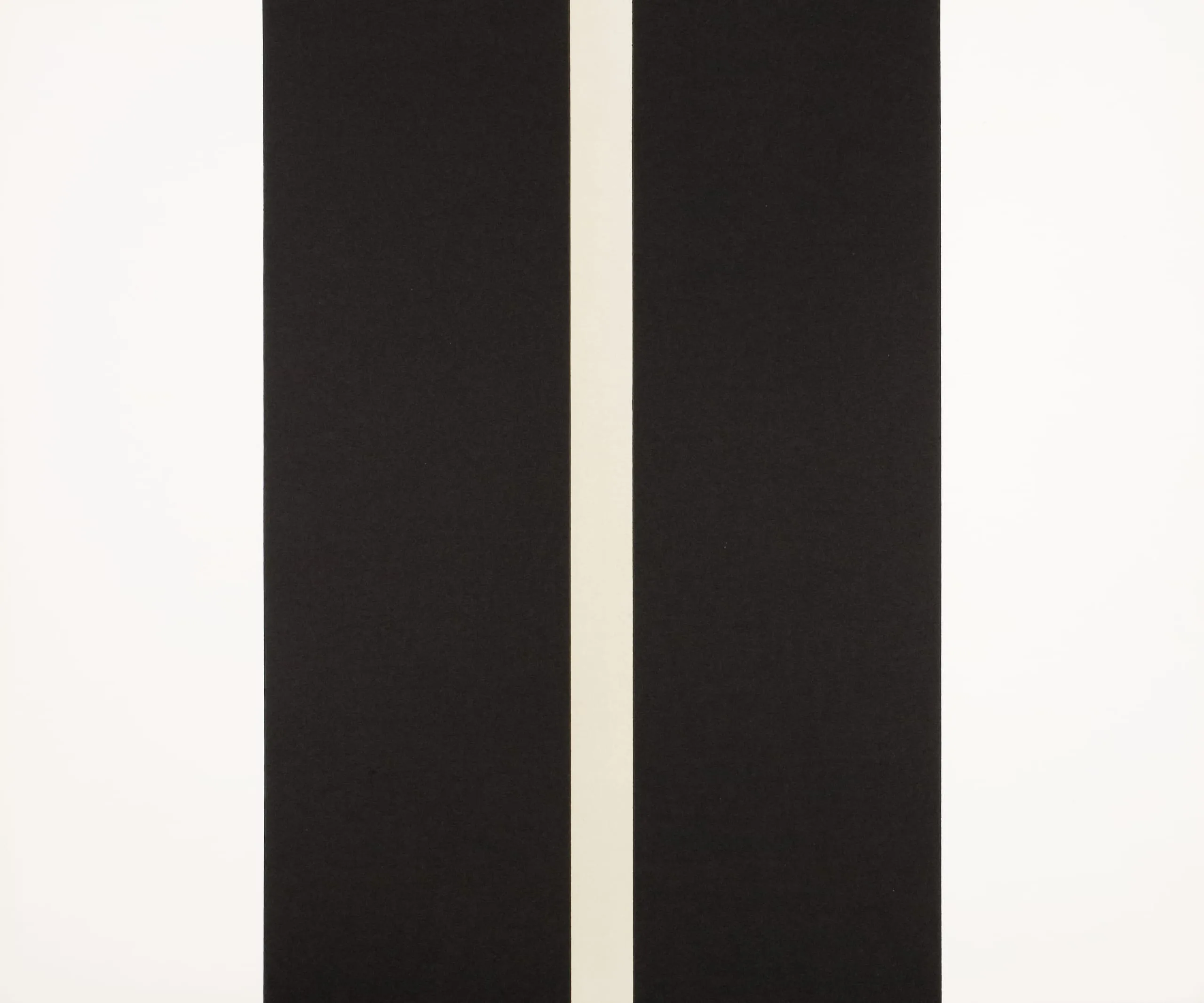 Abstract painting with a large vertical black rectangle bisected by a narrow cream stripe, set against a white canvas