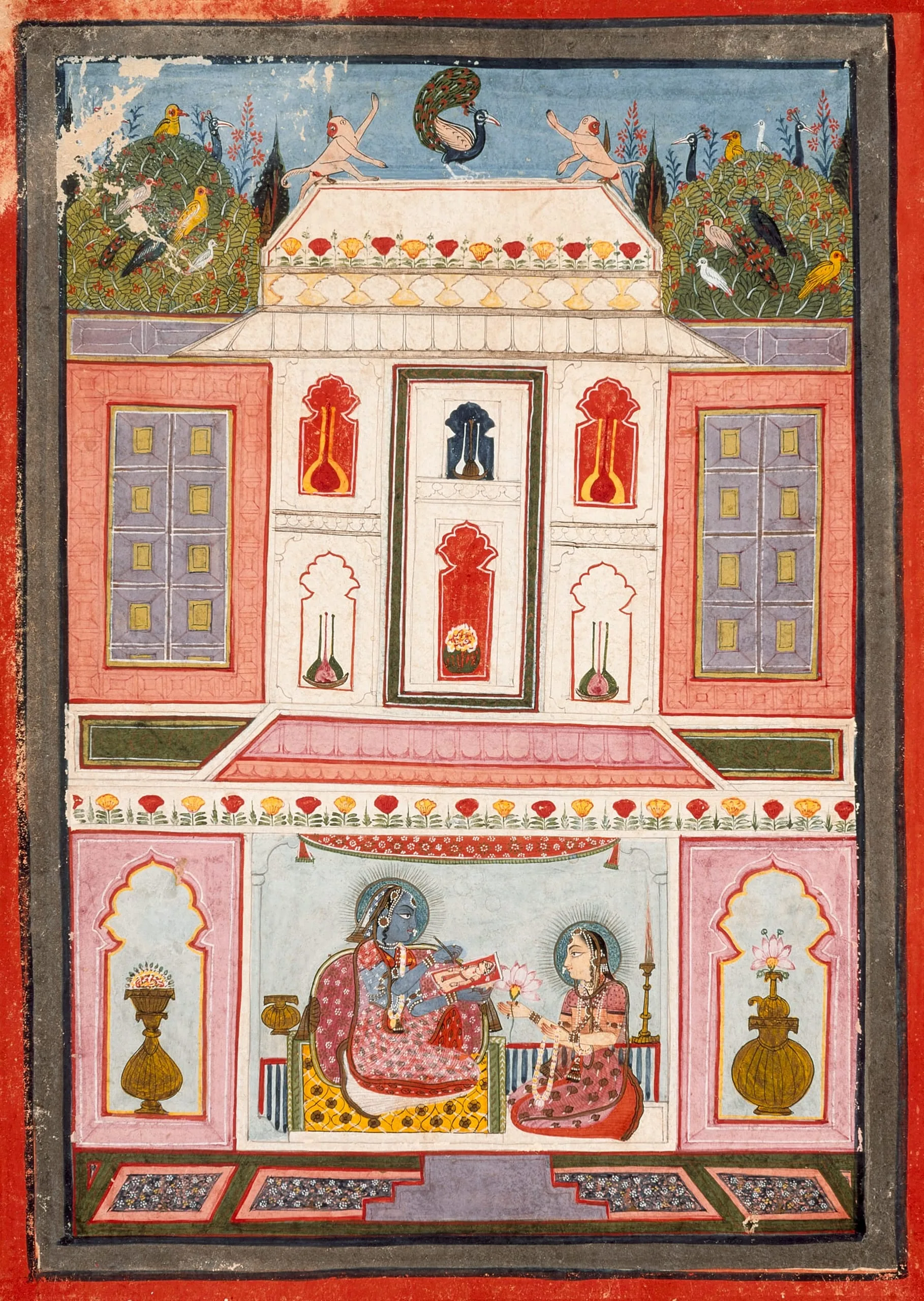 Here, a heroine with dark skin the color of grass (durba) is seated against a bolster on a verandah in a two-story palace. She is painting a portrait of a Rajput prince. A female companion sits in front of her holding a lotus and a floral garland. Both women are atypically nimbate. A golden lota is behind her. Behind her companion is a lamp (dipak), signifying her association with Dipak Raga. The blue sky indicates it is a daytime melody. See also M.81.8.10.