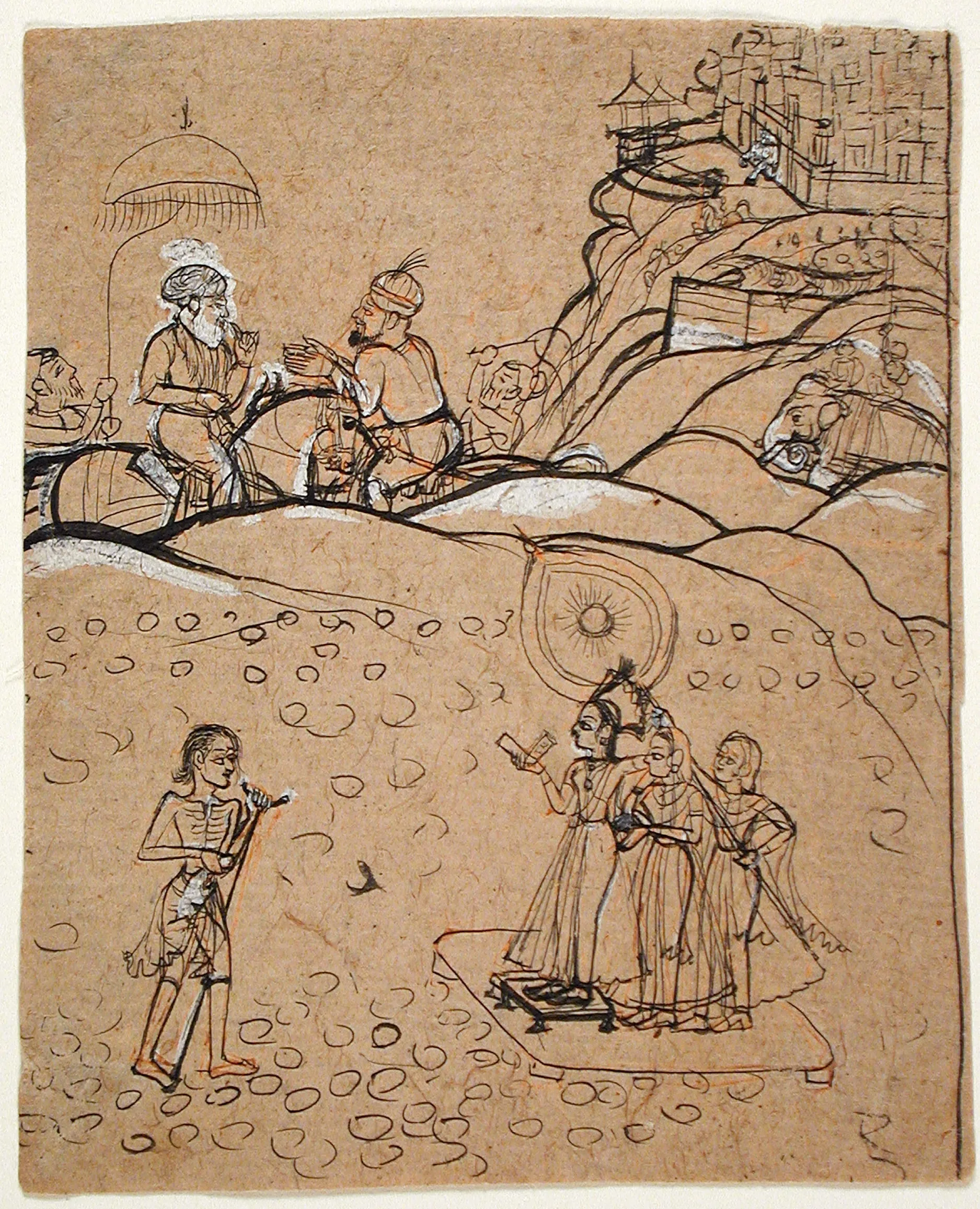 - Ink and opaque watercolor on paper