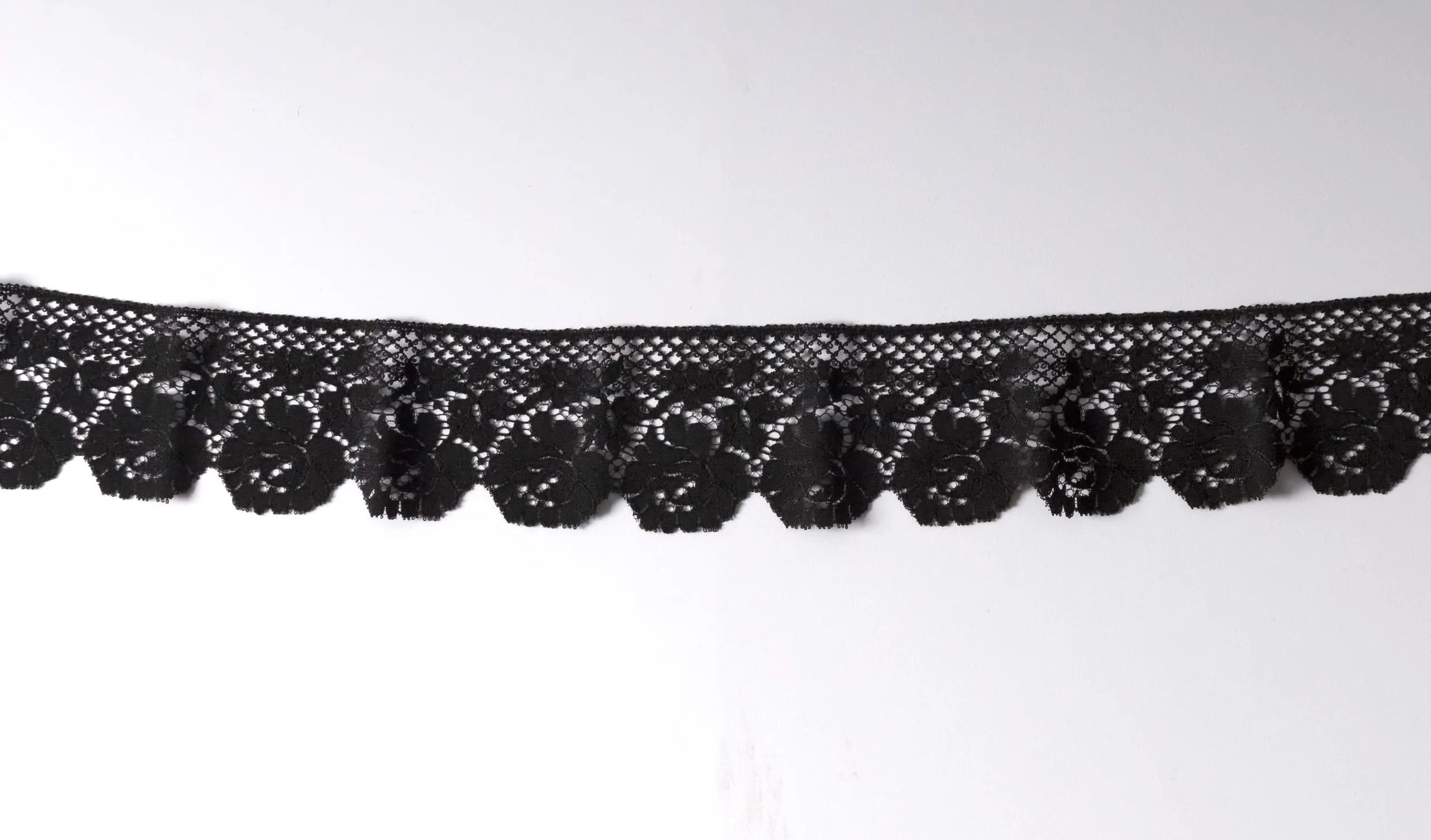 Strip of black lace trim with diamond mesh upper band and scalloped floral lower edge, photographed flat against a pale gray background