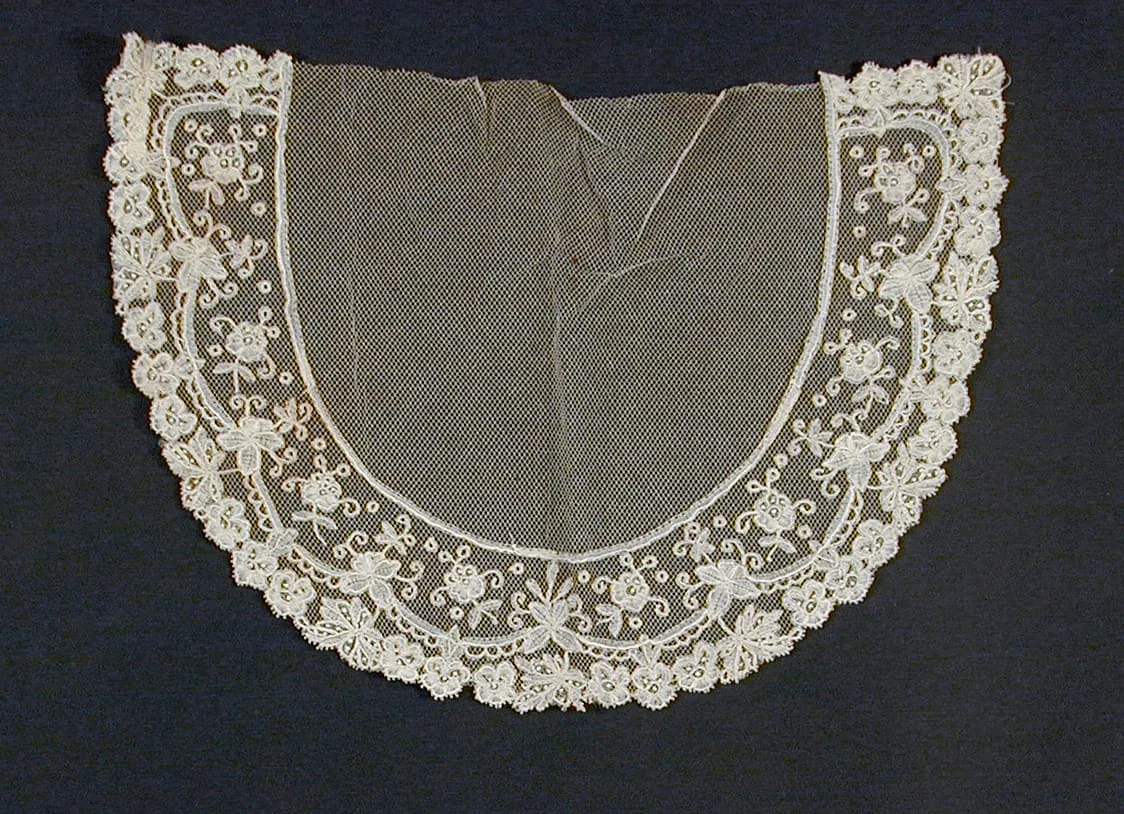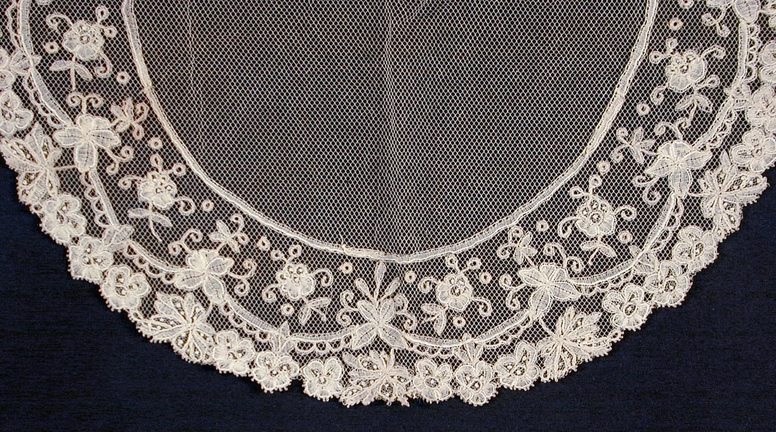 Cream-white semicircular lace collar with a fine mesh net ground and a wide border of raised floral and scroll motifs, displayed flat against a dark blue background