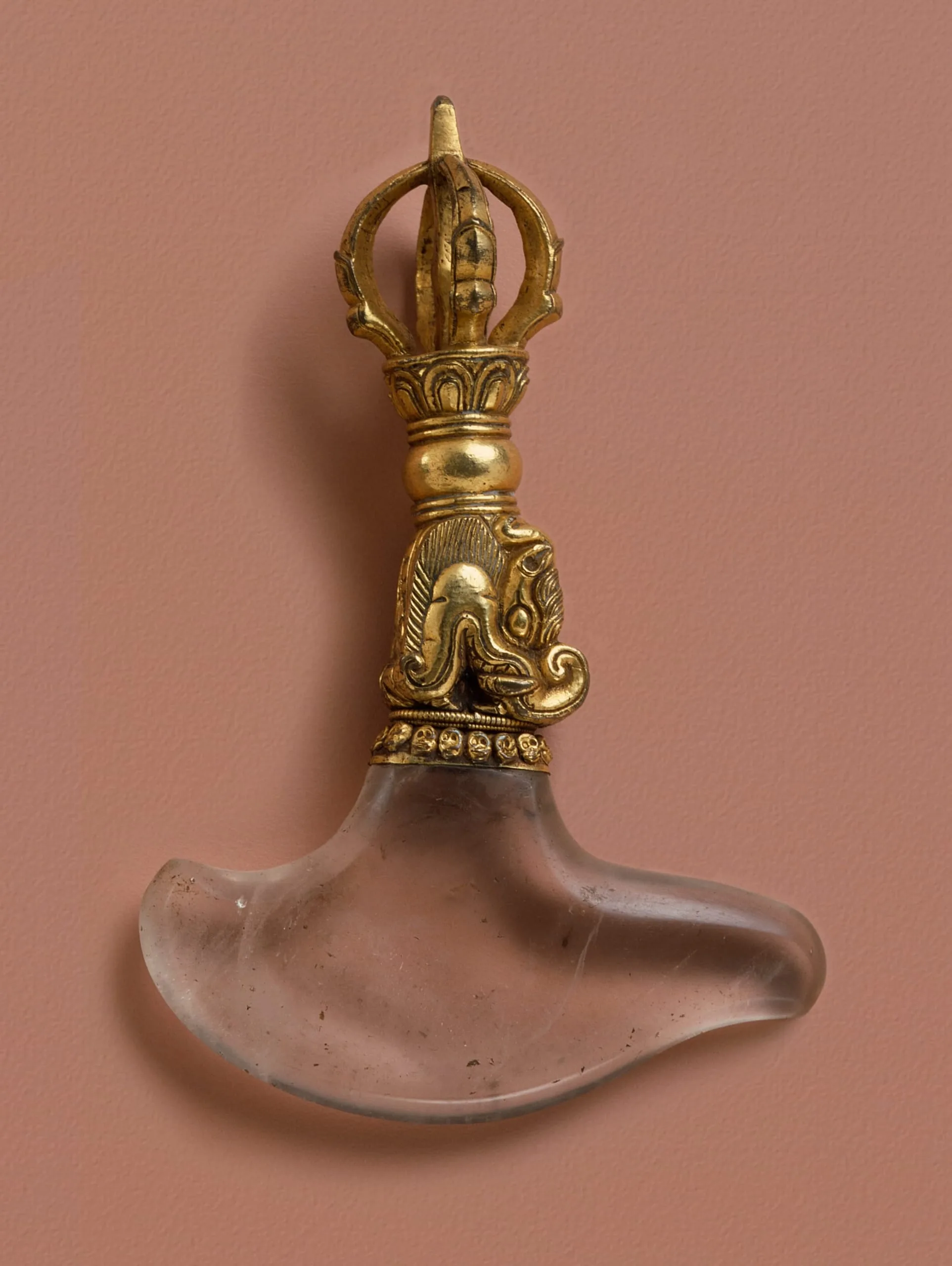 The Ritual Flaying Knife or Chopper has a rock crystal blade with a gilt copper alloy handle. The blade is attached to the mouth of the hilt by means of a clasp embellished with a row of grinning skulls. The blade appears to be issuing out of the mouth of a mythical aquatic animal (makara). Demarcated by plain roll borders, the ellipsoid-shaped grip is unadorned. A band of eight lotus petals forms the junction to the pommel in the form of a half-thunderbolt (vajra) with five prongs (four outer and central). See also AC1992.302.1.