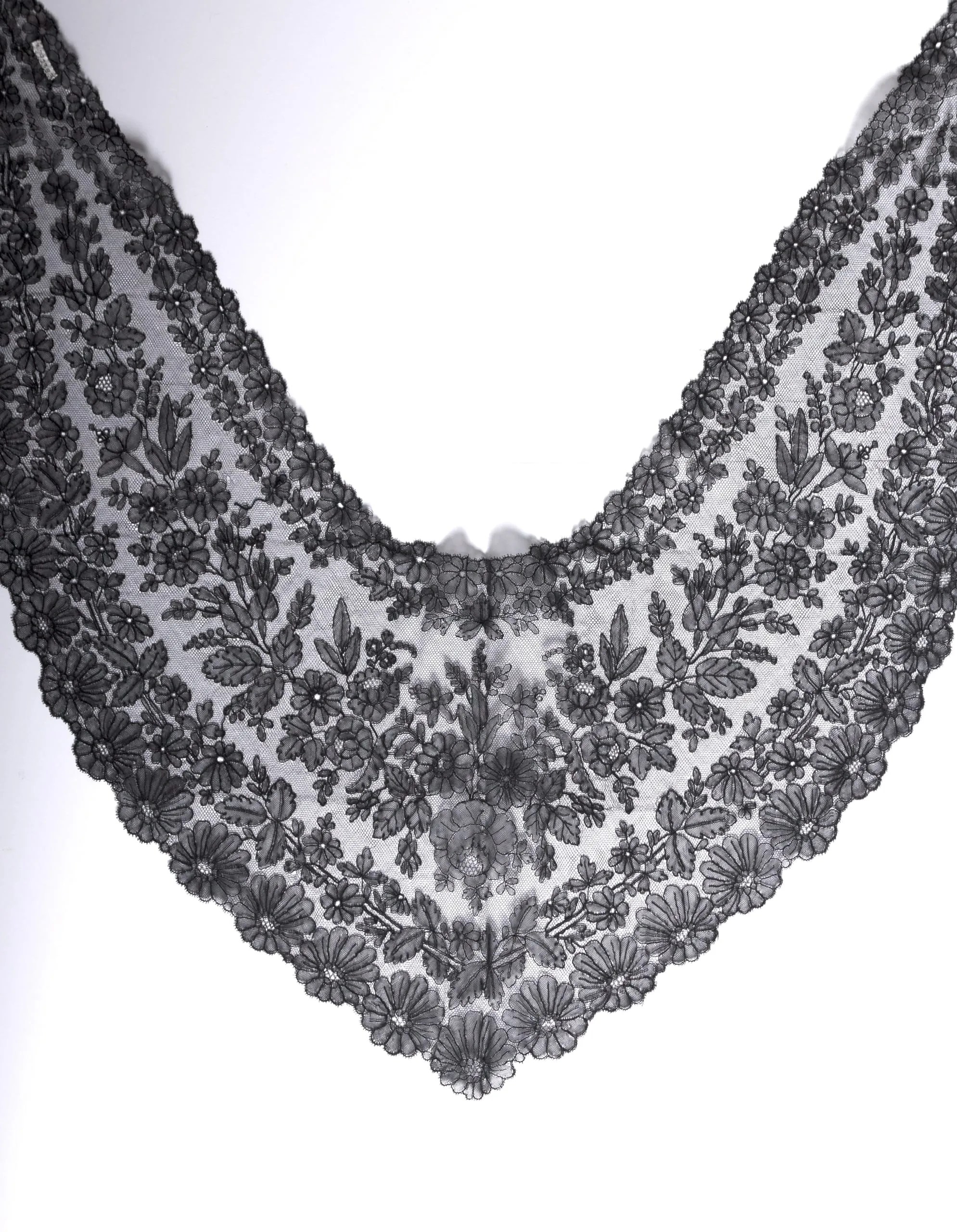 Black lace collar with allover floral pattern on sheer net ground, scalloped hem, and deep V-shaped neckline, displayed flat against white background