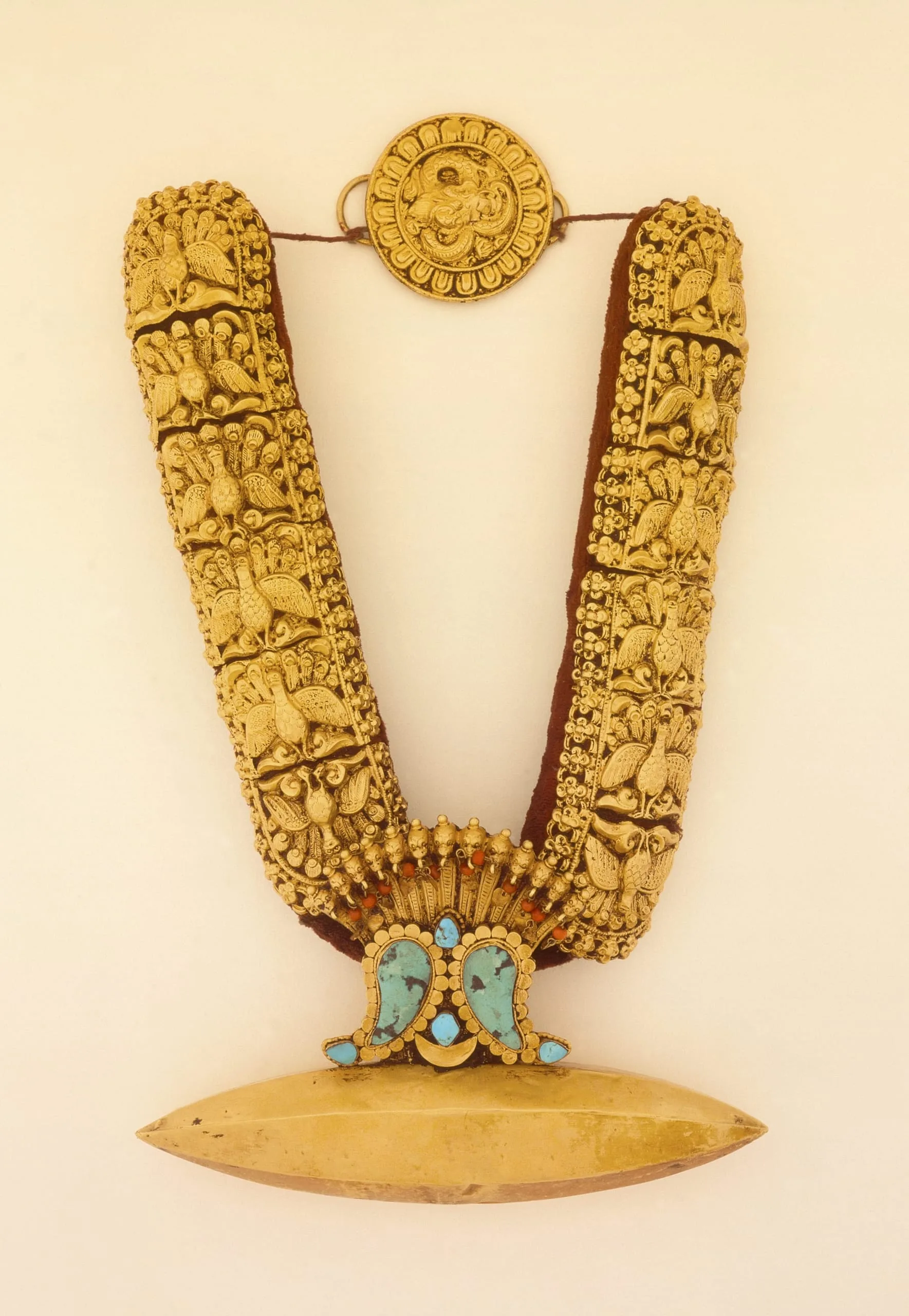 This is the distinctive ceremonial necklace (tayo) of Nepal’s Living Goddess, Kumari Devi, who is a manifestation of the Hindu great goddess Durga in her form as the protective goddess Taleju. It is also worn by brides and elite Newar women (see M.91.134). The lozenge-shaped horizontal pendant is an amulet container for symbolic grains of purified rice, gemstones, or a sacred verse. Surmounting it are a pair of comma-shaped turquoise plaques (paleswan-ha) set between sun and crescent moon symbols. They are reminiscent of the protective tiger-claw necklace pendants worn by Kumara (also known Skanda or Karttikeya), the Hindu god of war, as well as by Manjushri, the bodhisattva of wisdom (see M.81.3.1a-b). Rising above the grouping are thirteen rearing cobra heads with dangling coral beads symbolic of the serpents’ guarded treasures. The broad support "chains" of the necklace are adorned on each side with six repoussé panels of peacocks spreading their trains or tail feathers. Peacocks are the mount and, hence, symbolic of Kumara (see AC1994.183.1), and also his skati (female creative energy), Kaumari, a violent (ugra) form of Durga (see M.82.42.3) and a member of the Seven Mother Goddesses (Sapta Matrikas; see M.71.110.2 and (M.80.157). The lowest peacocks on the supports are inverted for design purposes. The backside of the supports is a padded textile mount. The lotiform medallion clasp has a writhing dragon in the center of a band of lotus petals.