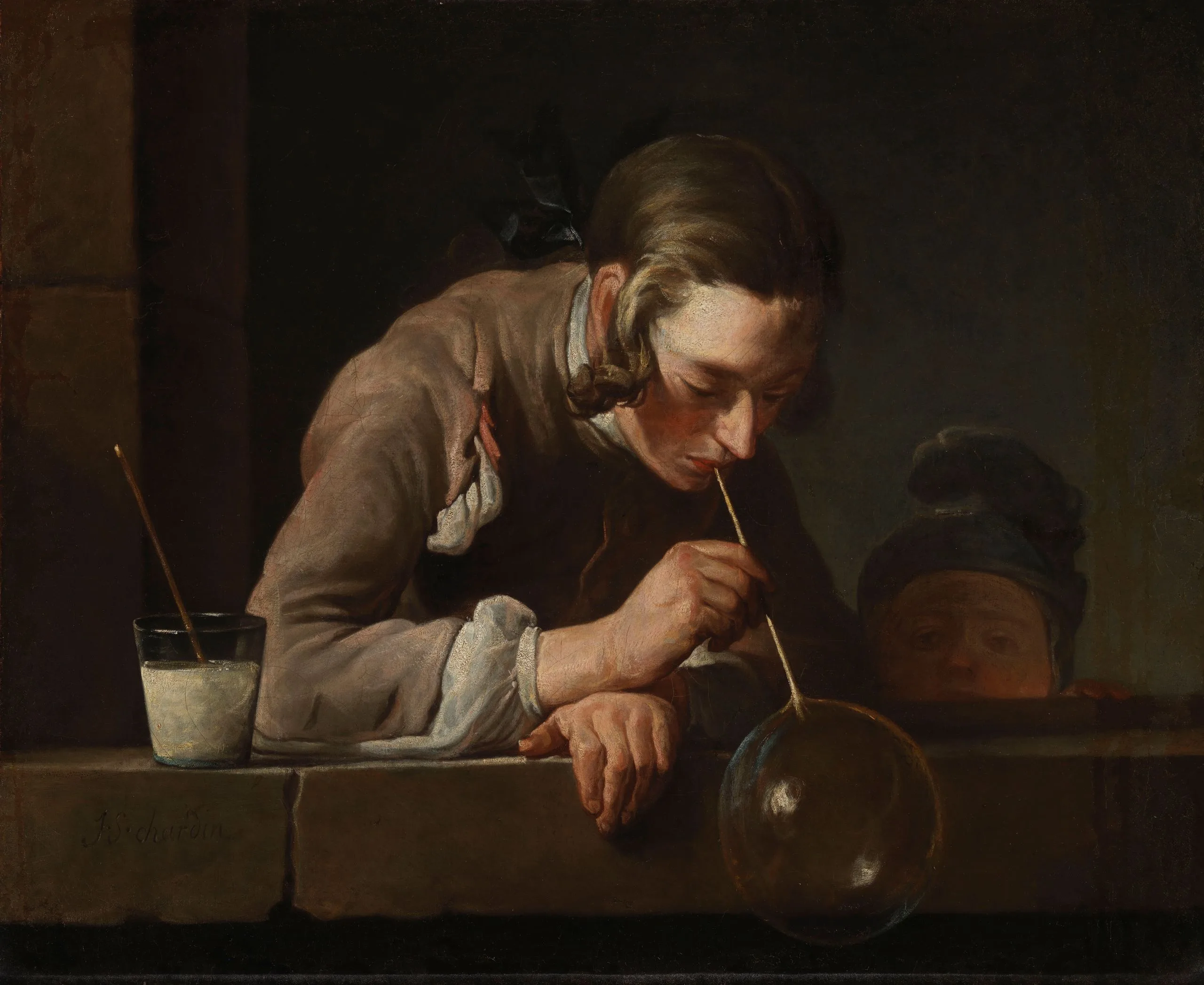 Soap Bubbles is carefully composed in the simplest of geometries, with the window forming a rectangular space to frame the pyramidal grouping of the youth and the boy transfixed by the spherical bubble; these shapes are reinforced by the masonry, angles of the youth's arms, and the pair of heads. Chardin renders surfaces carefully but without distracting detail. A sense of timeless contemplation transforms the ephemeral pastime of the pair into a compelling allegory about the transitory nature of life. This is far from being a scene of carefree, youthful abandon.