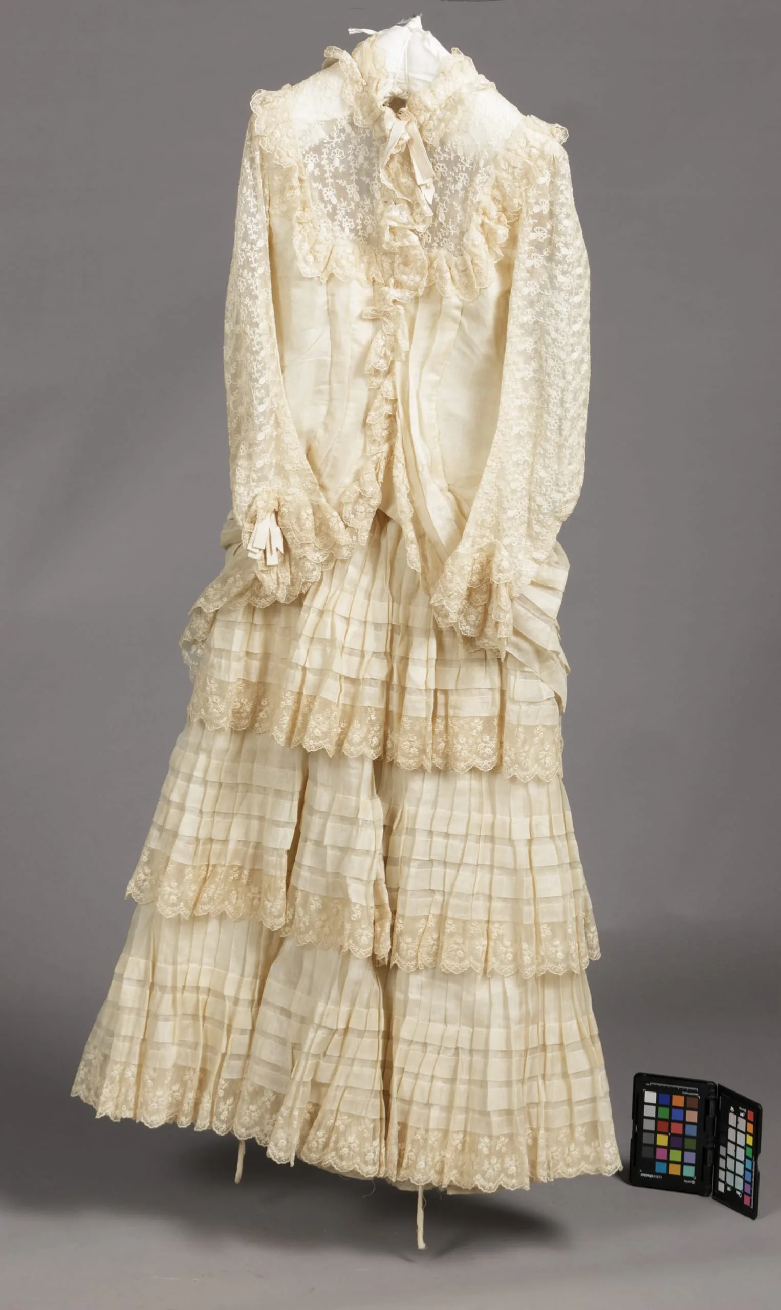 - Cotton plain weave (mull) with cotton lace, cotton embroidery, and silk grosgrain ribbon