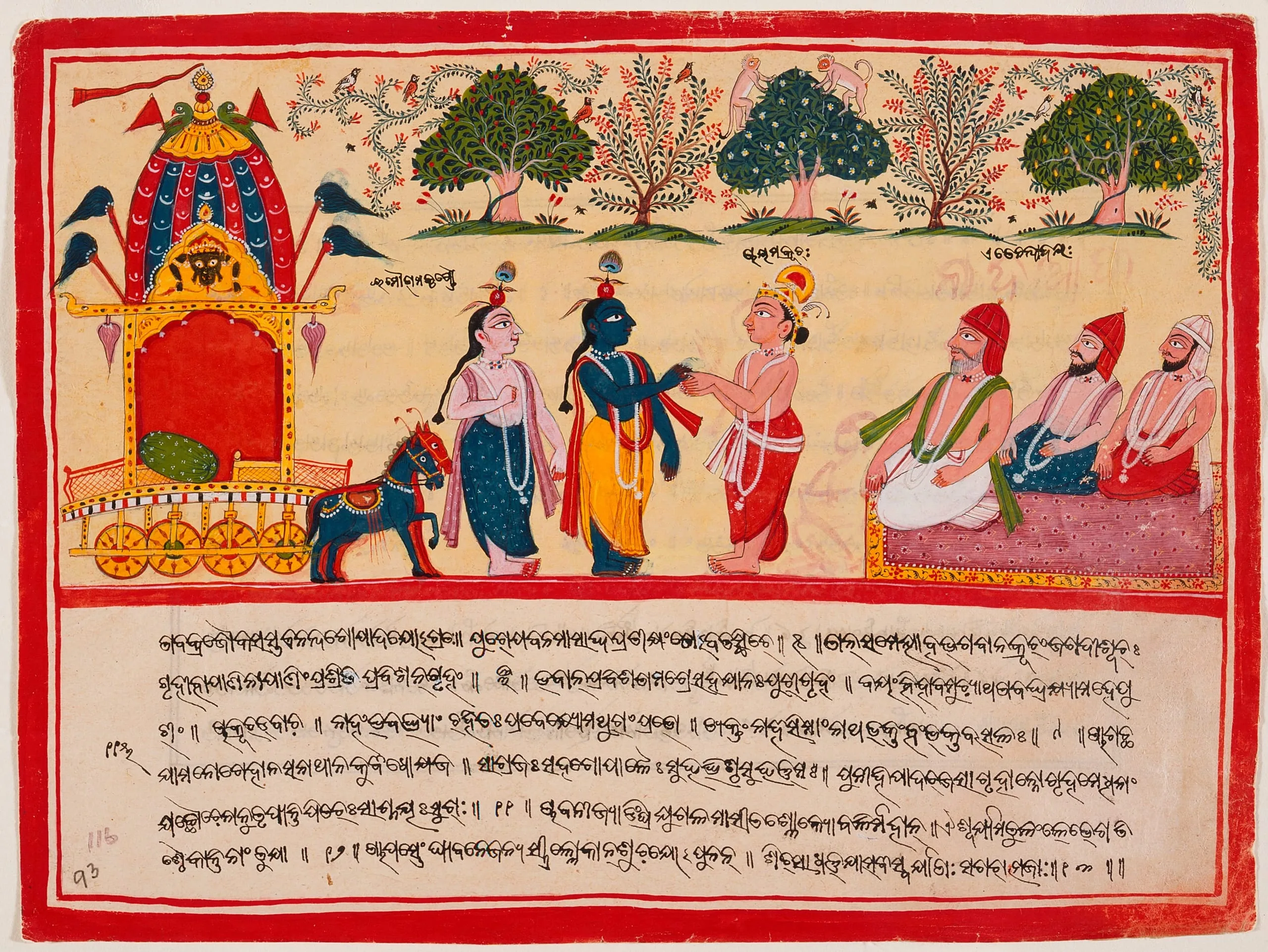 In contrast to the slightly earlier Odhisan Bhagavata Purana folio M.75.114.7 in which the Sanskrit text is written in devanagari, here the Sanskrit verses are written in Odia (Oriya) script.
