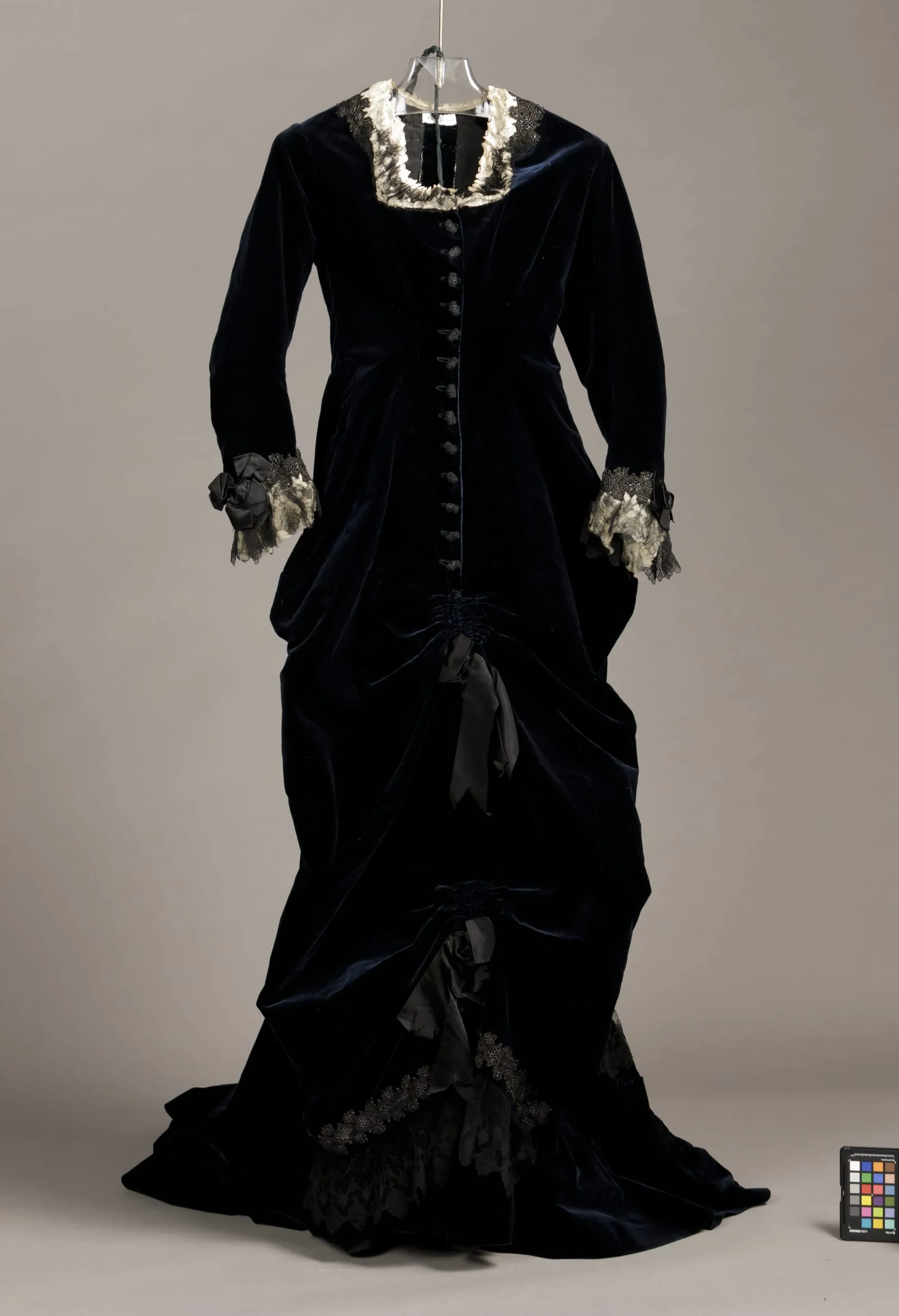- Dress: silk velvet with silk satin ribbon, silk lace, cotton lace, silk gauze, silk cord, and jet bead trim; Sash: silk satin