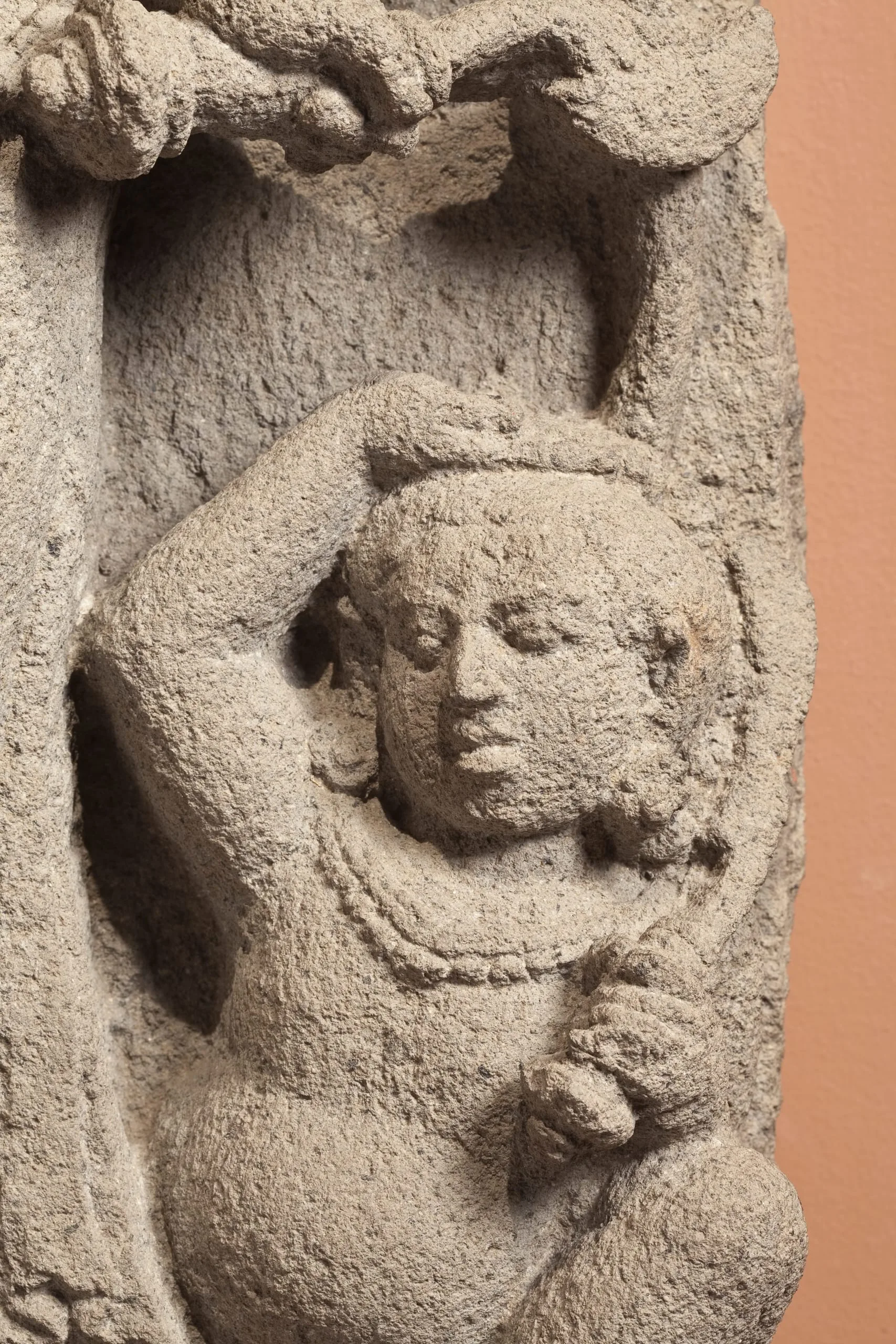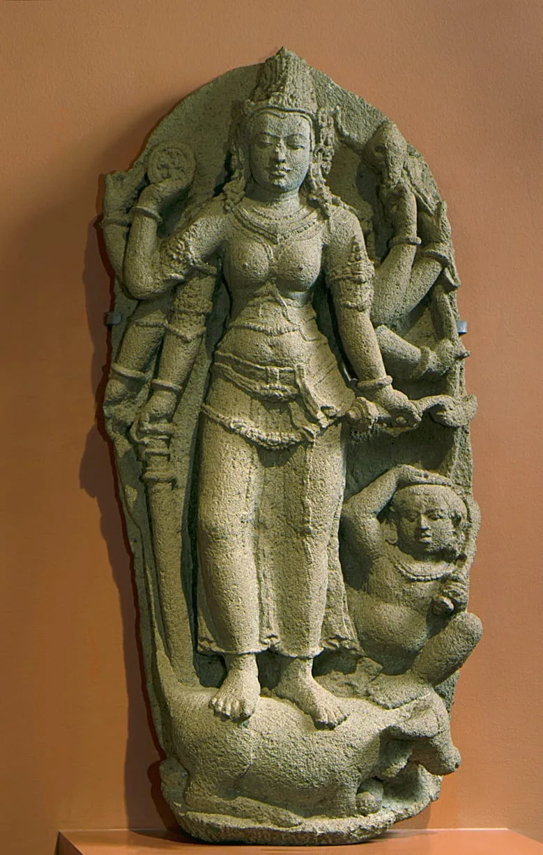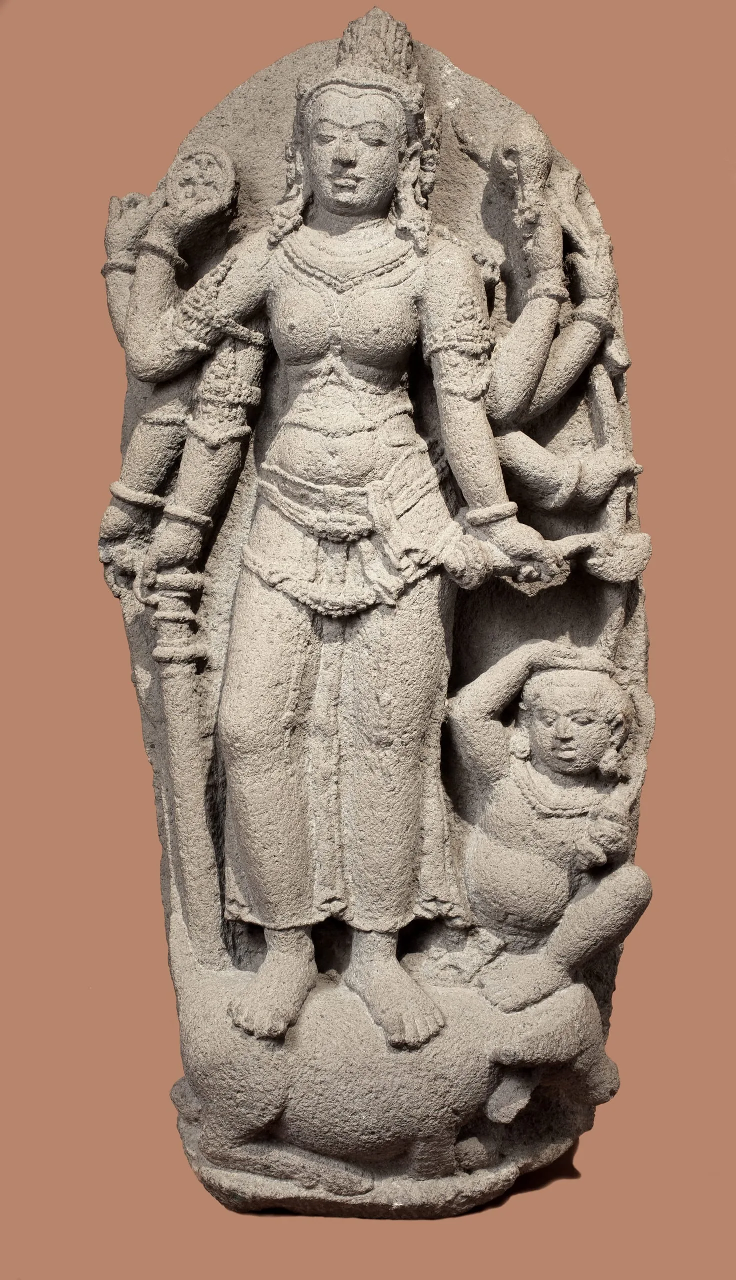 The goddess Durga is an aspect of the magna mater, the great mother or goddess of Near Eastern cultures, and goes back to paleolithic times. Associated with fecundity and abundance, this goddess entered India with the Indo-Greeks, becoming a cult figure and the subject of many small stone icons in the Kushan period (first-third centuries). By the Gupta era (320-600) Durga was a supreme goddess to her devotees. She embodies sakti, the creative or cosmic energy underlying all of creation.