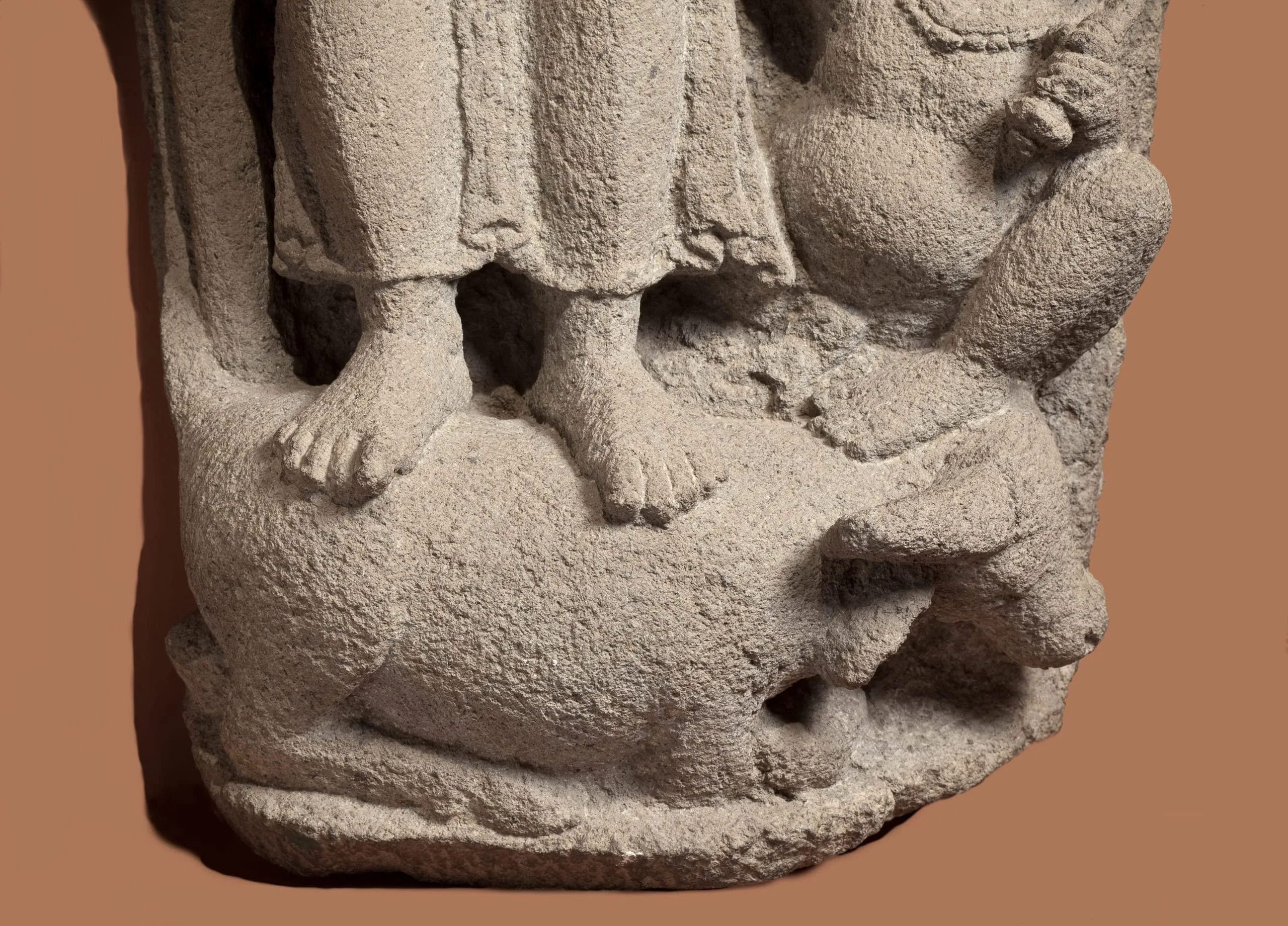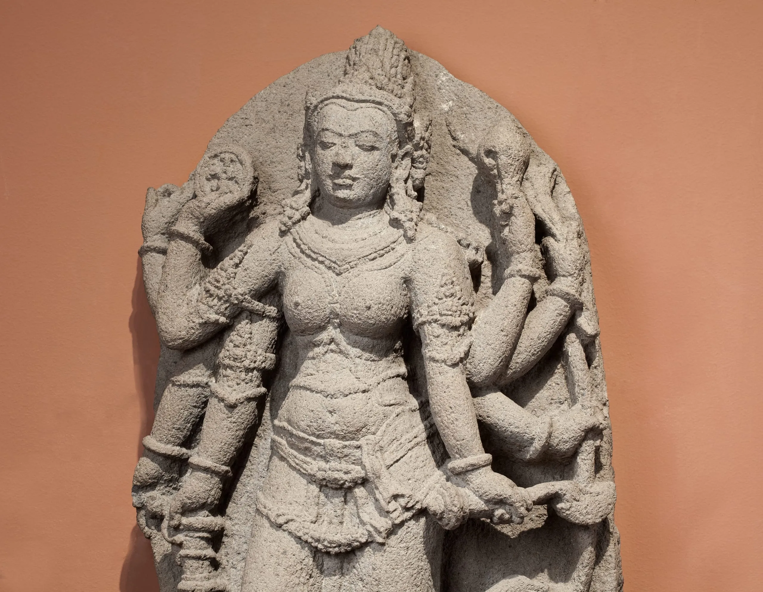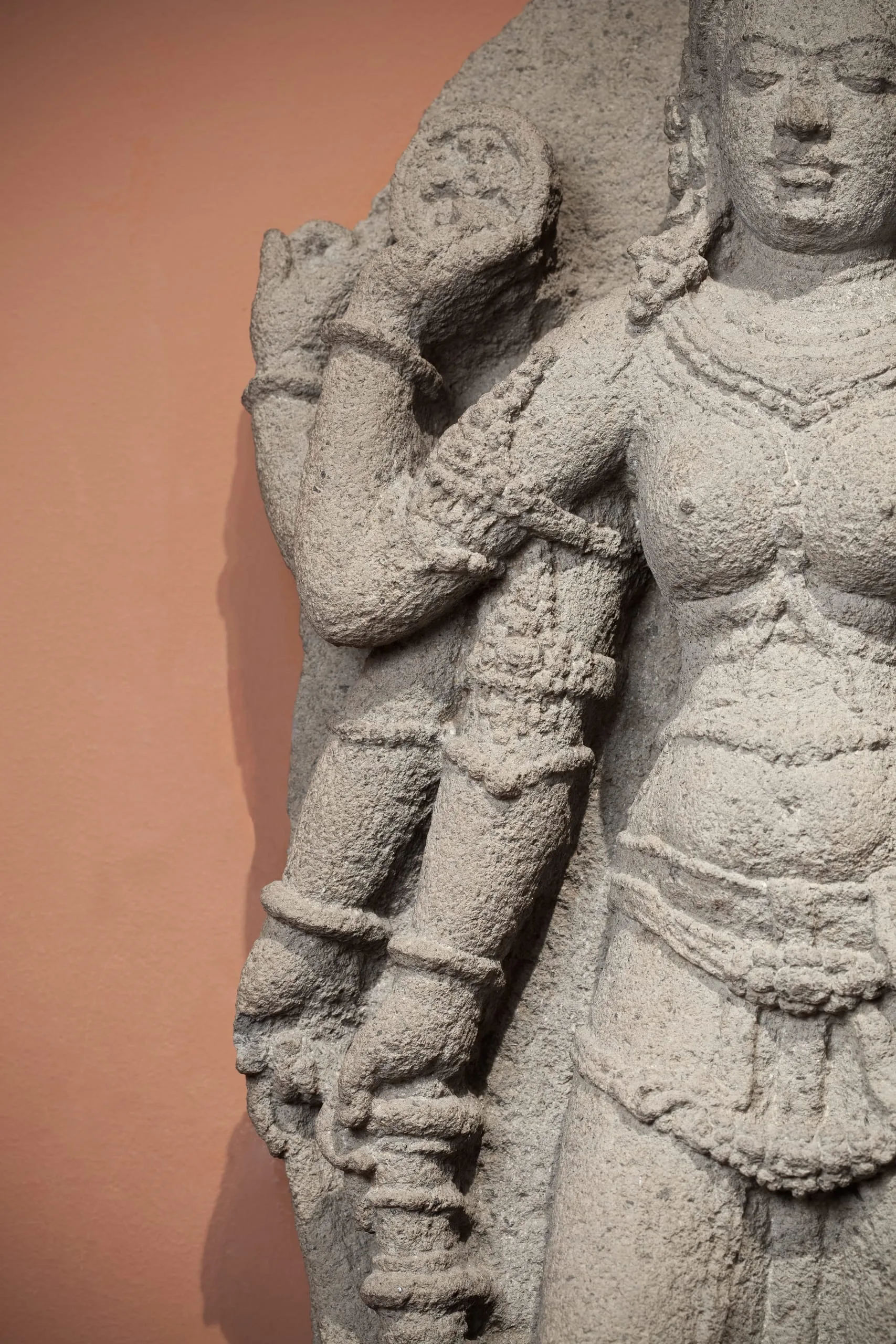 Here Mahisa encounters Durga with eight arms and numerous powerful weapons the gods gave her: a conch shell, bow, snake noose, axe, club, and mace. Although Indian representations of this battle are graphic, Javanese depictions are much less lurid. This sculpture lacks Durga's fierce companion and vehicle, the lion, and the buffalo is not mutilated, perhaps in acknowledgment of its essential role in Javanese culture, where it was indispensable in the cultivation of rice. The animal lies almost placidly under Durga's feet. Durga stands serene and graceful in her triumph as the cherubic demon emerges, gesturing with an upraised hand to ward off her wrath.
