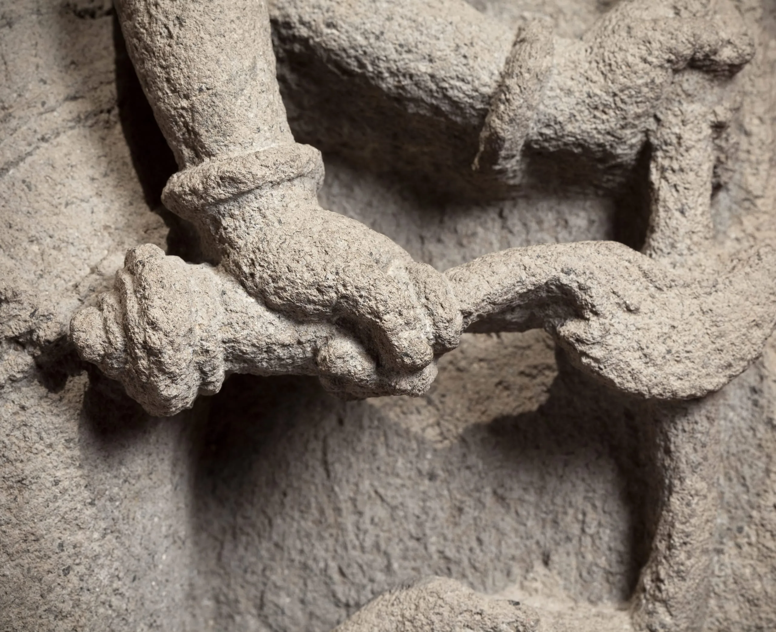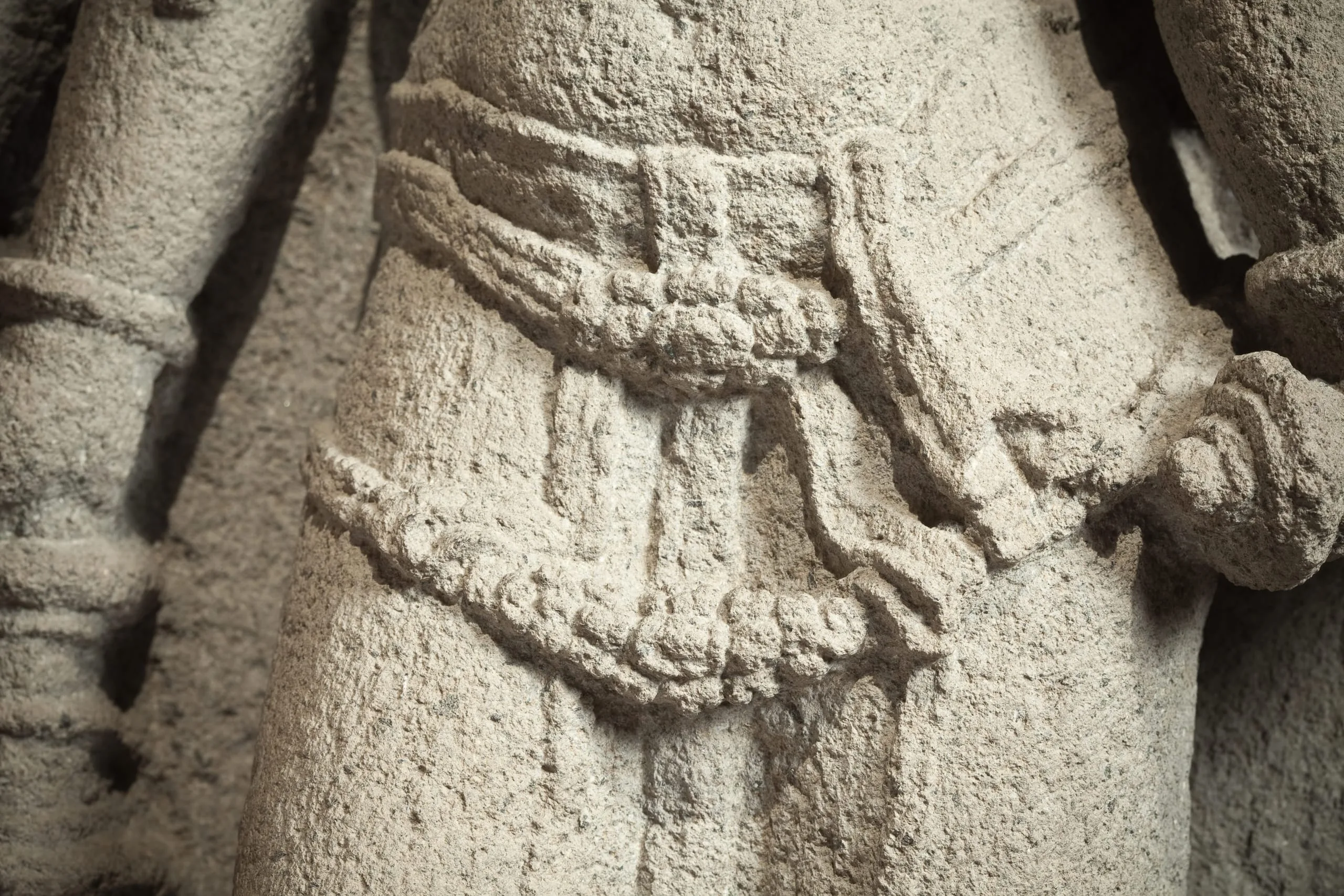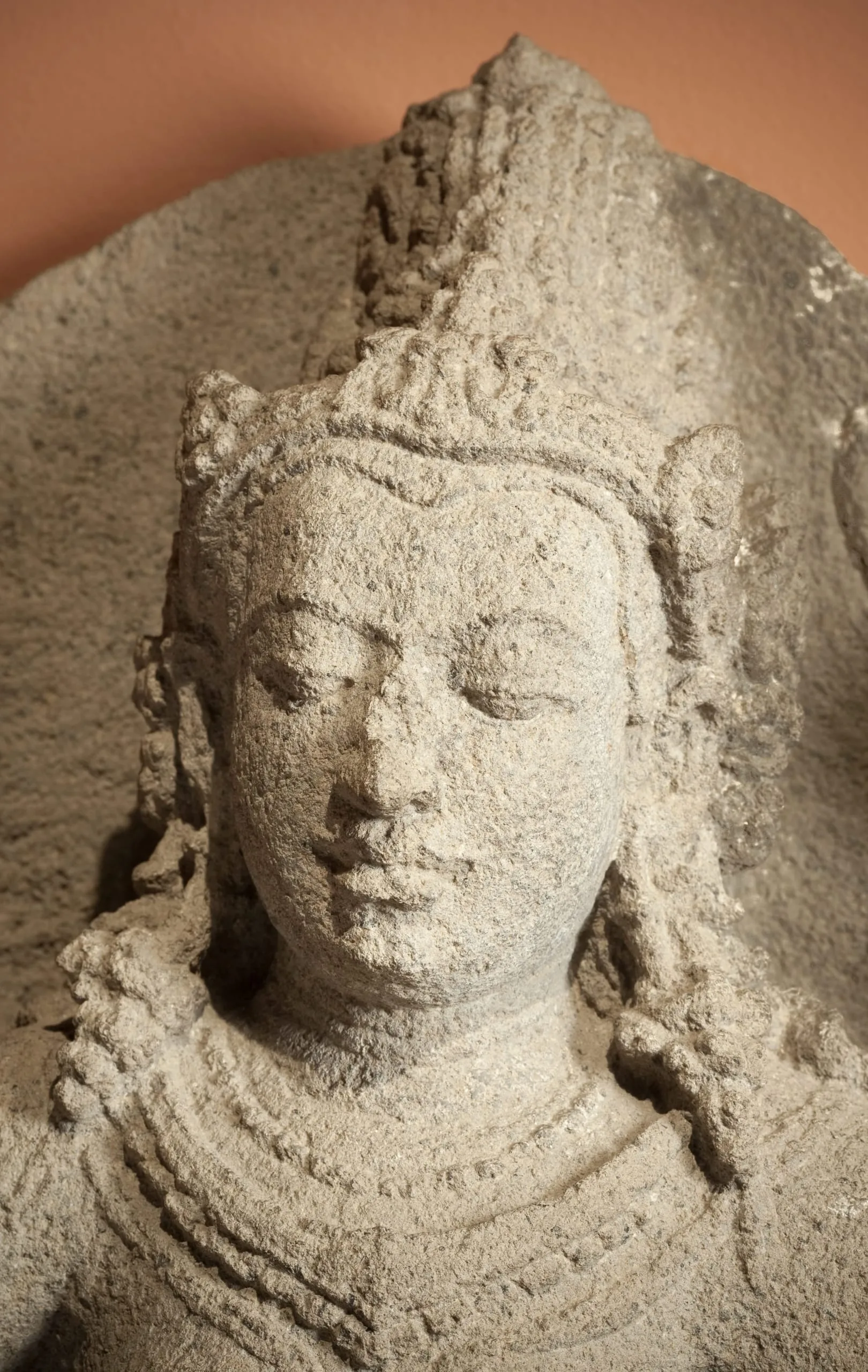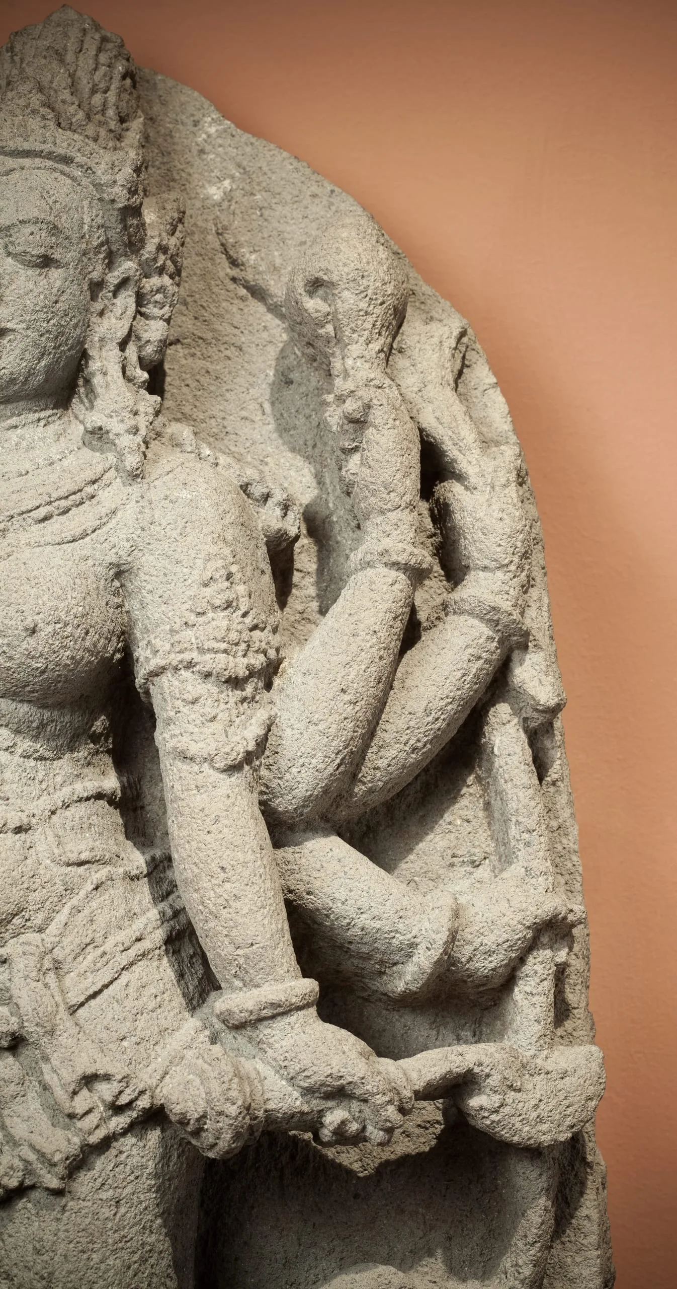 Here Mahisa encounters Durga with eight arms and numerous powerful weapons the gods gave her: a conch shell, bow, snake noose, axe, club, and mace. Although Indian representations of this battle are graphic, Javanese depictions are much less lurid. This sculpture lacks Durga's fierce companion and vehicle, the lion, and the buffalo is not mutilated, perhaps in acknowledgment of its essential role in Javanese culture, where it was indispensable in the cultivation of rice. The animal lies almost placidly under Durga's feet. Durga stands serene and graceful in her triumph as the cherubic demon emerges, gesturing with an upraised hand to ward off her wrath.