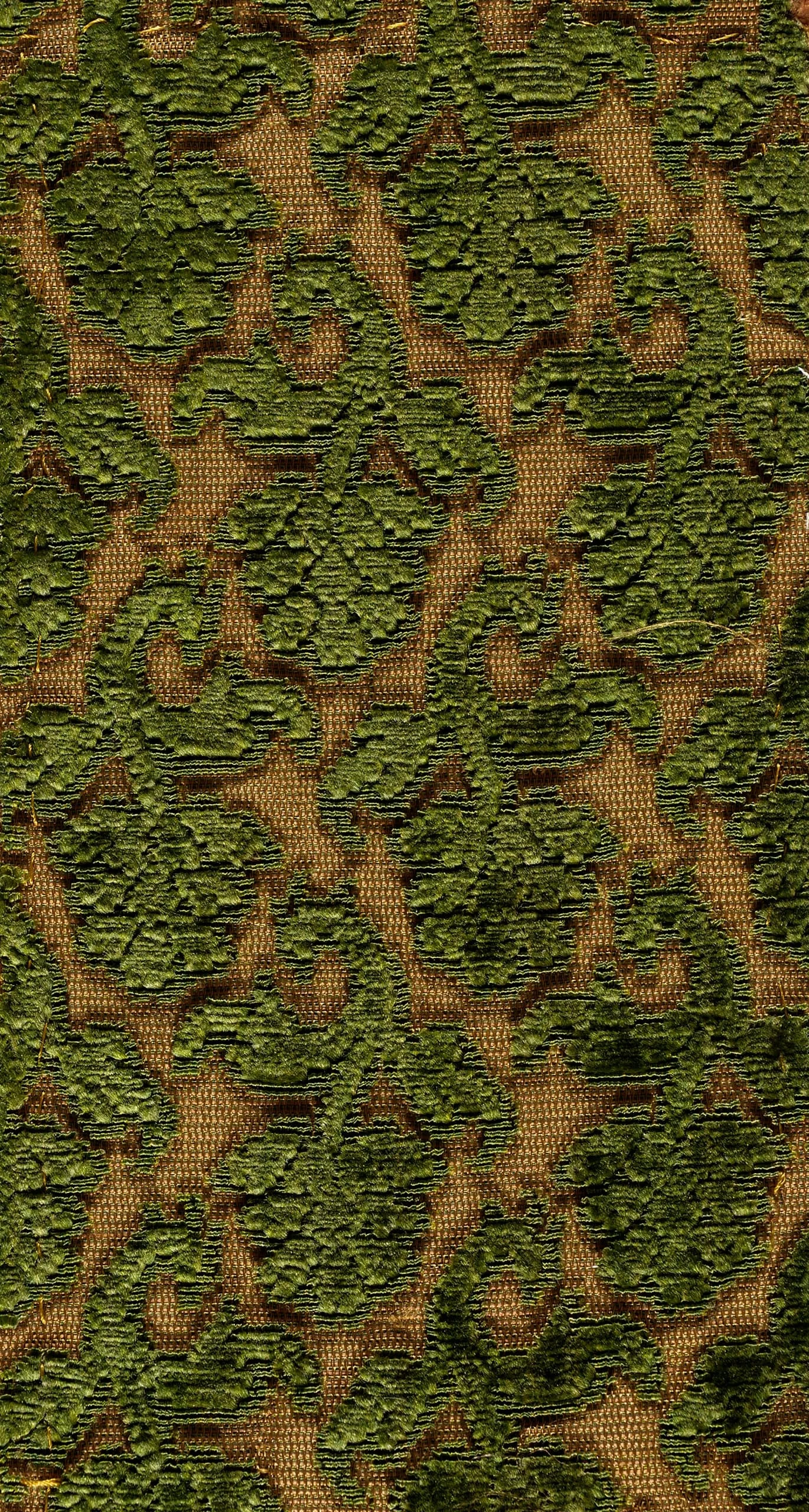 Close-up of a voided velvet textile with raised olive-green pile in an organic, leaf-like pattern over a golden-brown woven ground