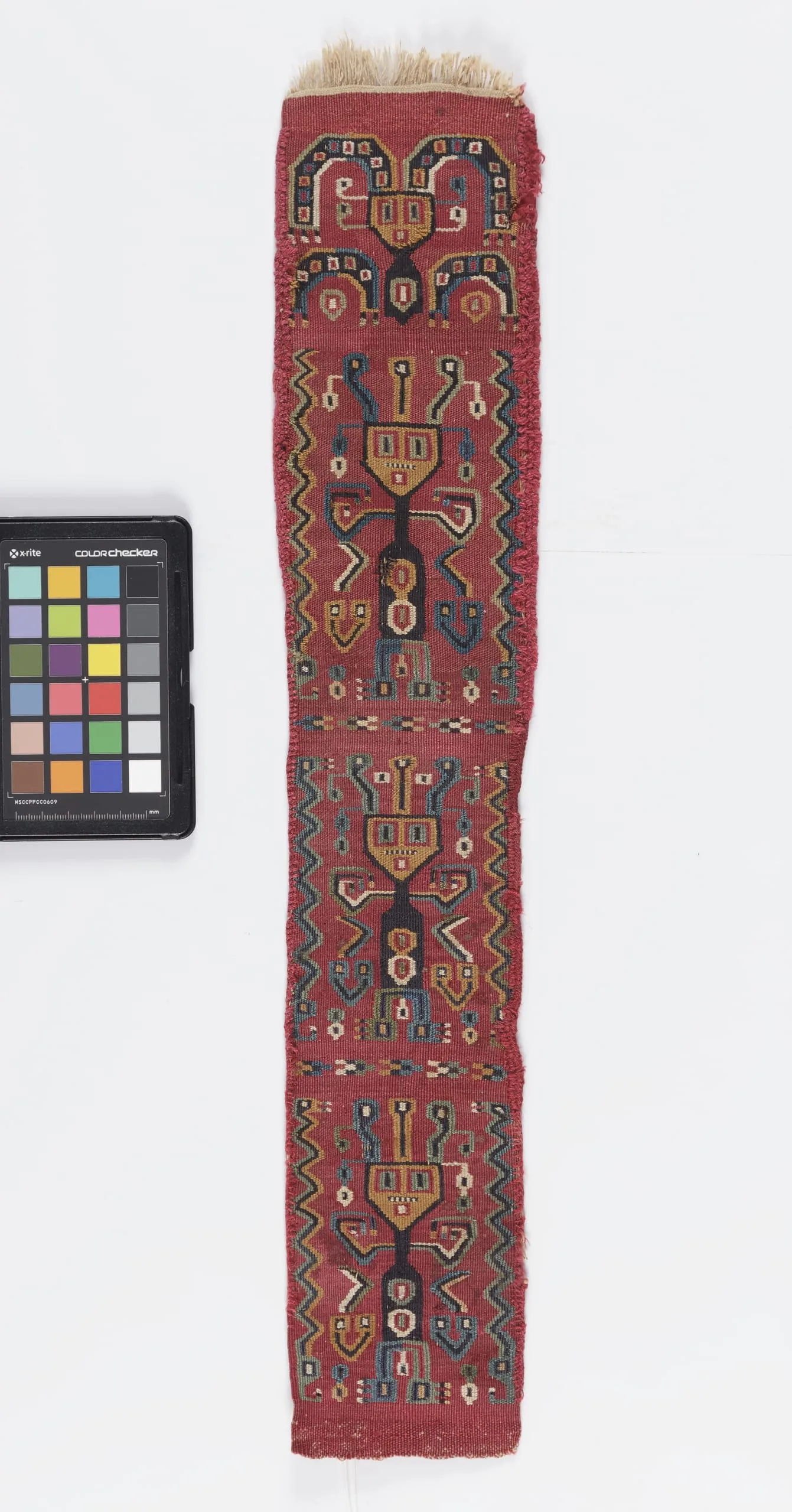 Narrow vertical textile fragment with brick-red ground, repeating stylized figural motifs in yellow, black, blue, and green, framed by zigzag borders