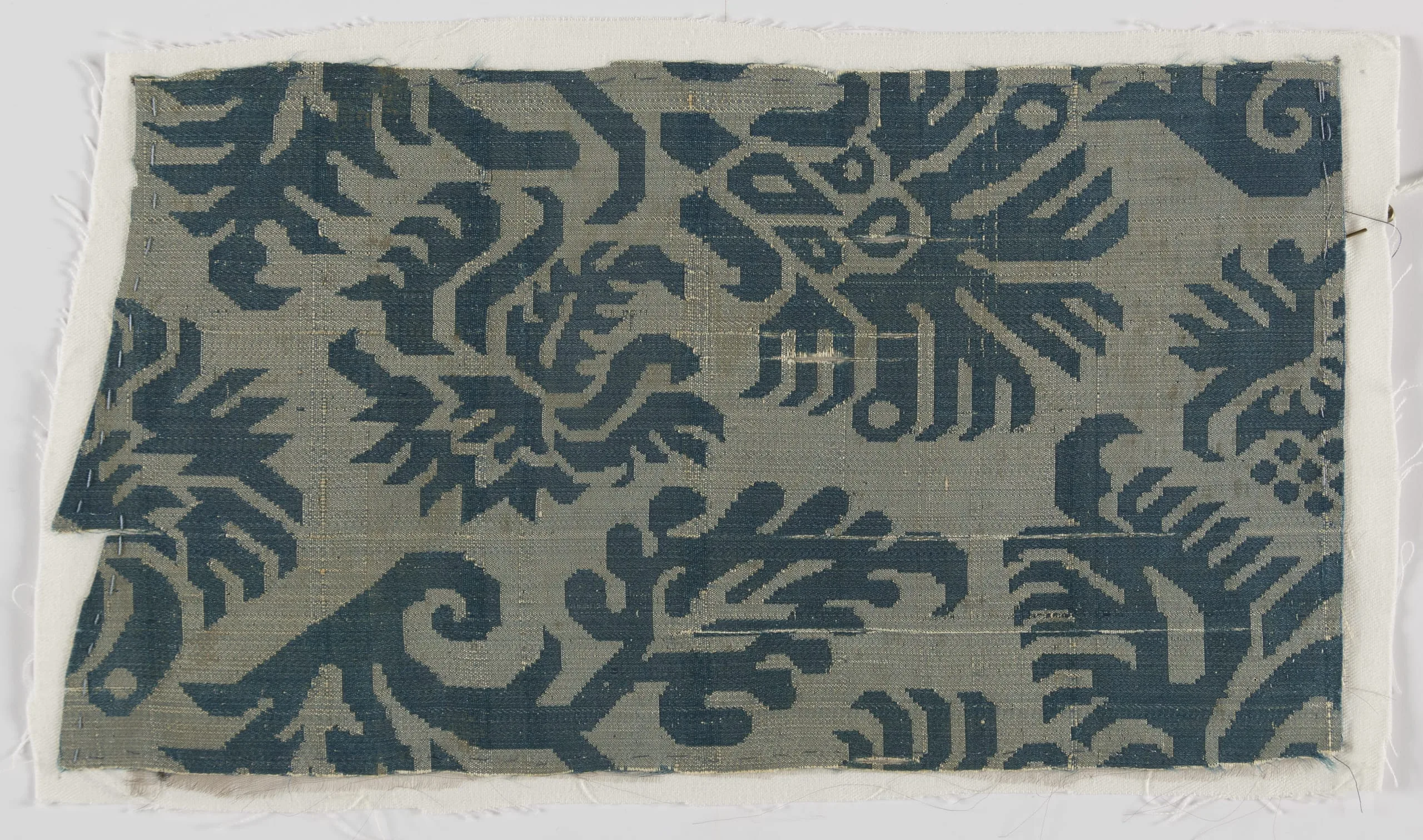 Horizontal woven textile fragment with a two-tone navy and slate-blue allover pattern of stylized birds or griffins, scrolling spirals, and angular leaf forms