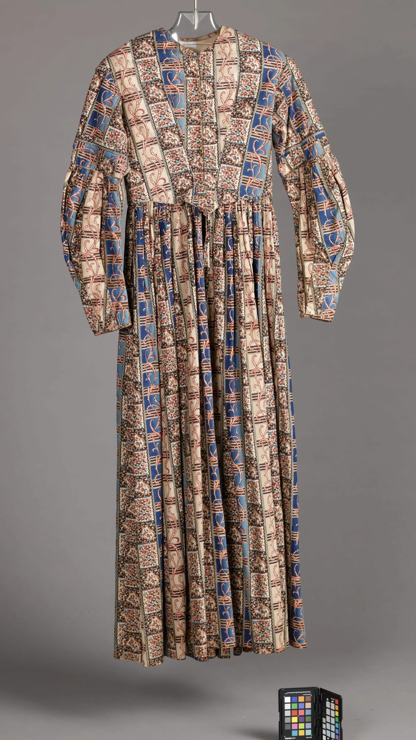 Full-length printed cotton dress on a hanger, featuring a grid-block pattern in cobalt blue, brick red, and cream, with a pleated bodice, full sleeves, and gathered skirt
