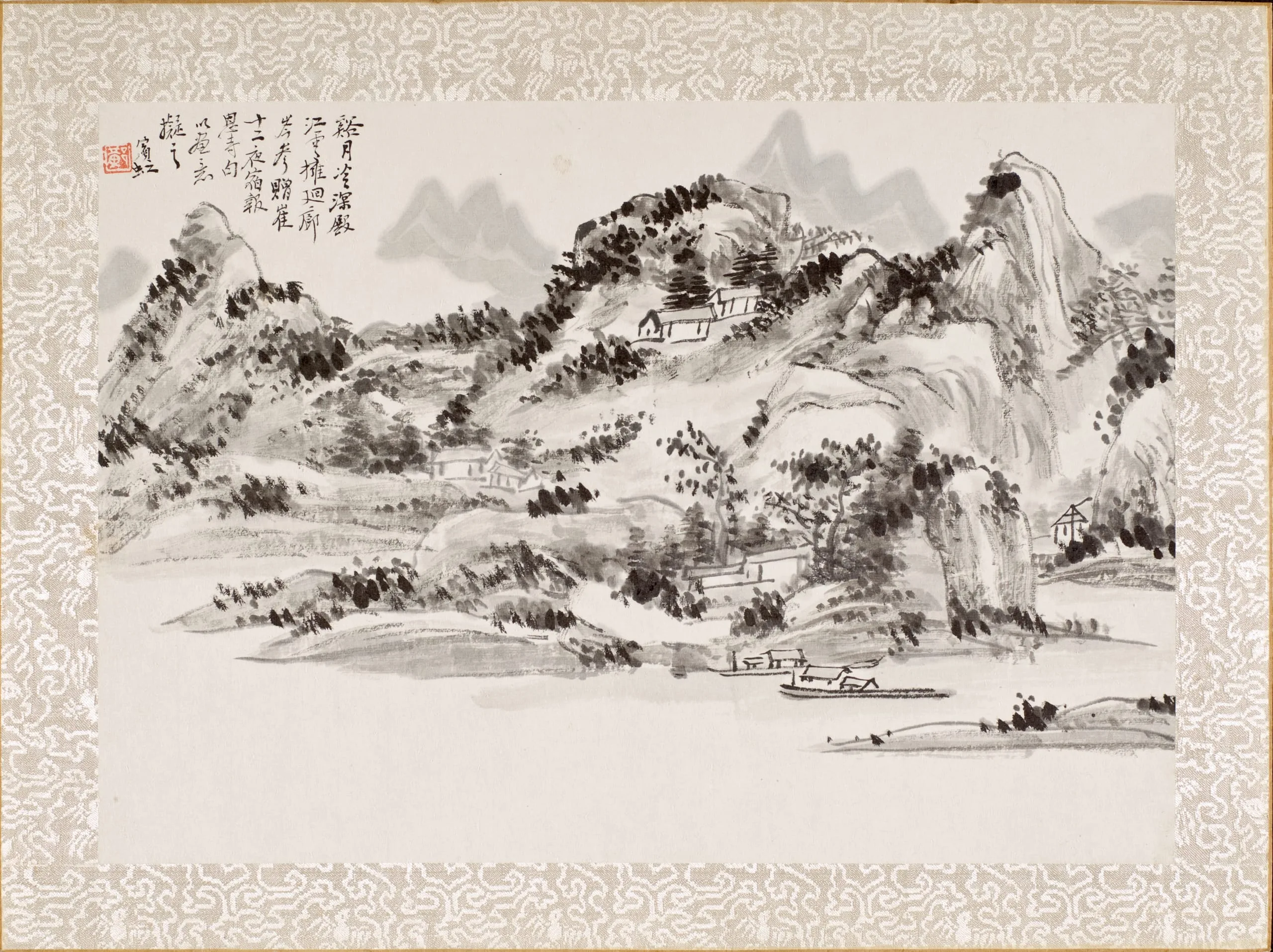 Ink and wash landscape painting on cream paper, mounted on silk, showing mountains, tree-covered hills, small buildings, and boats on still water, with Chinese inscription and red seal in upper left