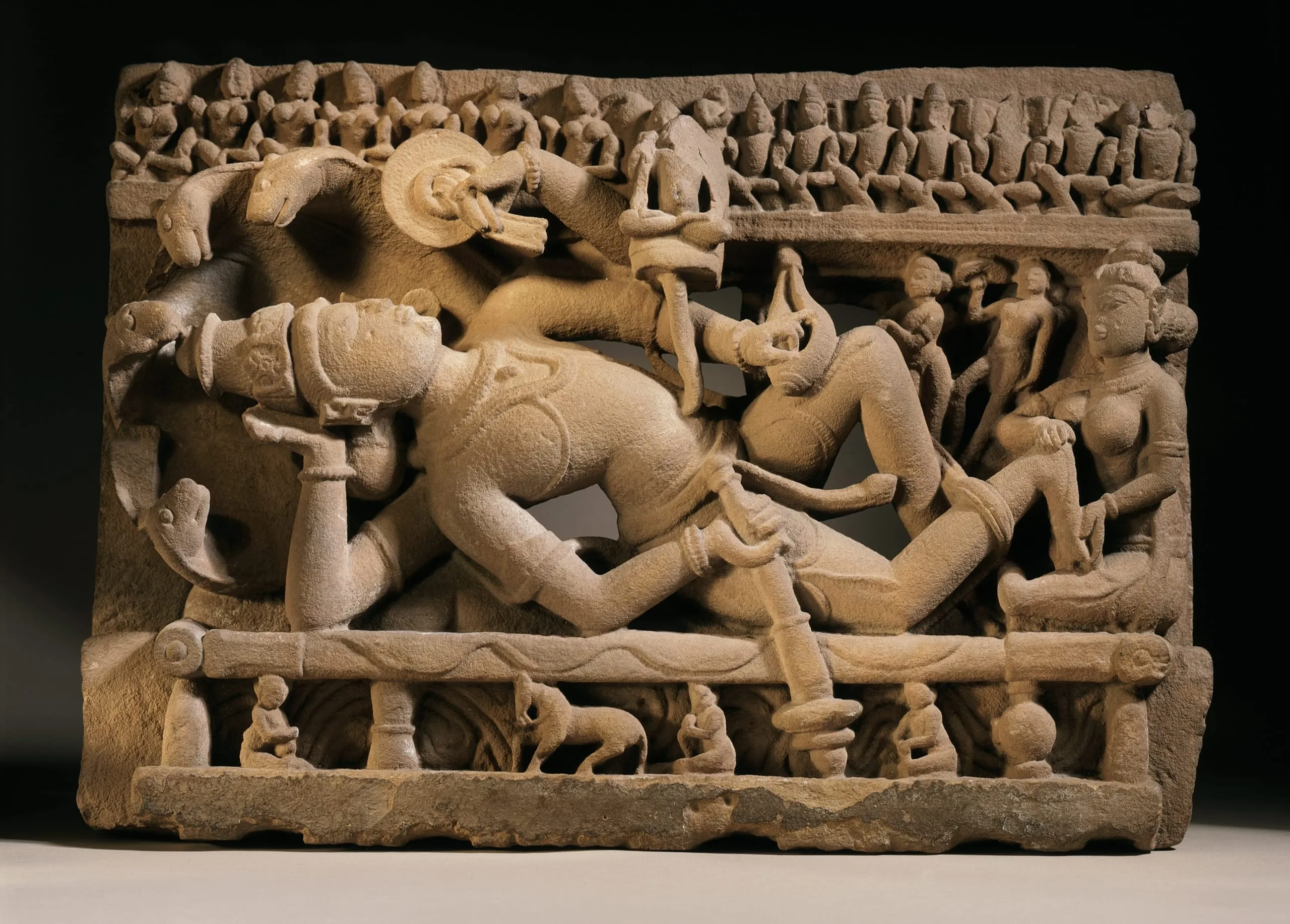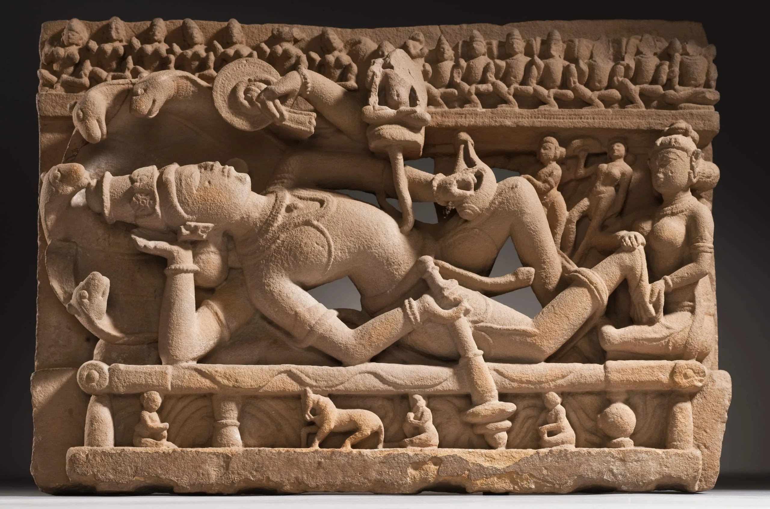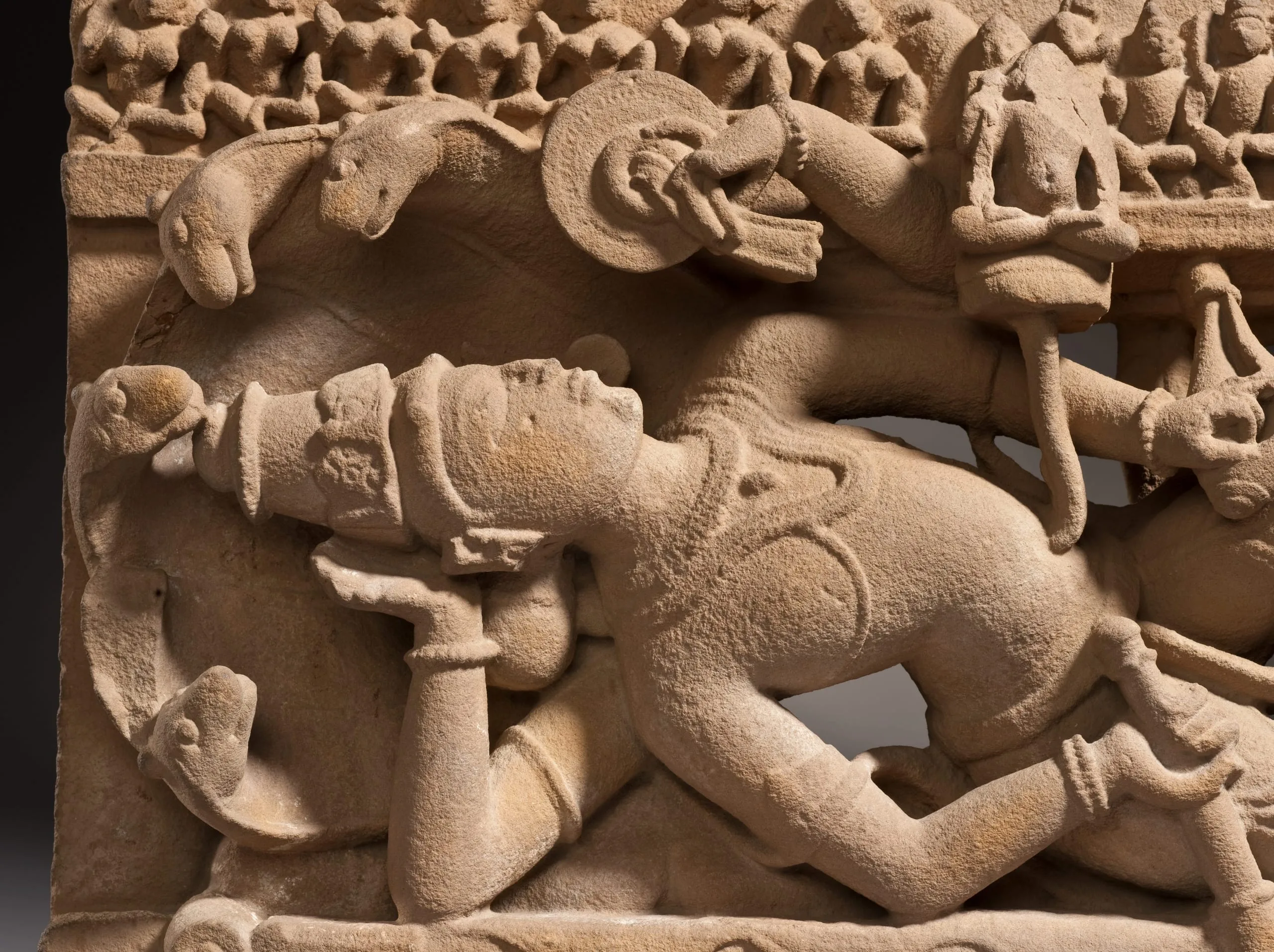 Vishnu, the Hindu God of Preservation, is asleep on the five-headed serpent named Ananta (Eternity) or Shesha (Remainder), who is atypically shown supported by a cot (charpoi) floating on the primordial ocean of milk. His wife Lakshmi is massaging his foot, thereby stimulating him to dream the history of the universe during each cosmic age (kalpa). Vishnu is crowned and has four arms. His upper right hand supports his head. His lower right hand holds his mace. His upper left hand holds his discus. His upper lower left hand grasps his conch. A now-damaged figure of Brahma, the God of Creation, sits on a lotus rising out of Vishnu’s naval. Seated along the top edge are the seven mother goddesses (sapta matrikas) on the left and the nine planetary deities (nava grahas) on the right. The planetary deities are represented from right to left, with the final divinity somewhat obscured behind Brahma. Beneath the cot are three seated figures, two vessels, and a horse. They likely represent Lakshmi, the divine physician Dhanvantari, the elixir of immortality (amrita), and a poison, all of which emerged from the sea with Vishnu’s help in a related myth, the churning of the milk ocean.